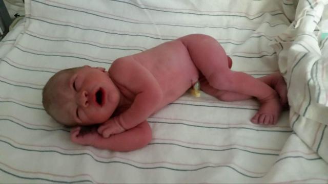 Painting of a newborn baby surrounded by sunflowers and a brown dog lying on a wooden deck.