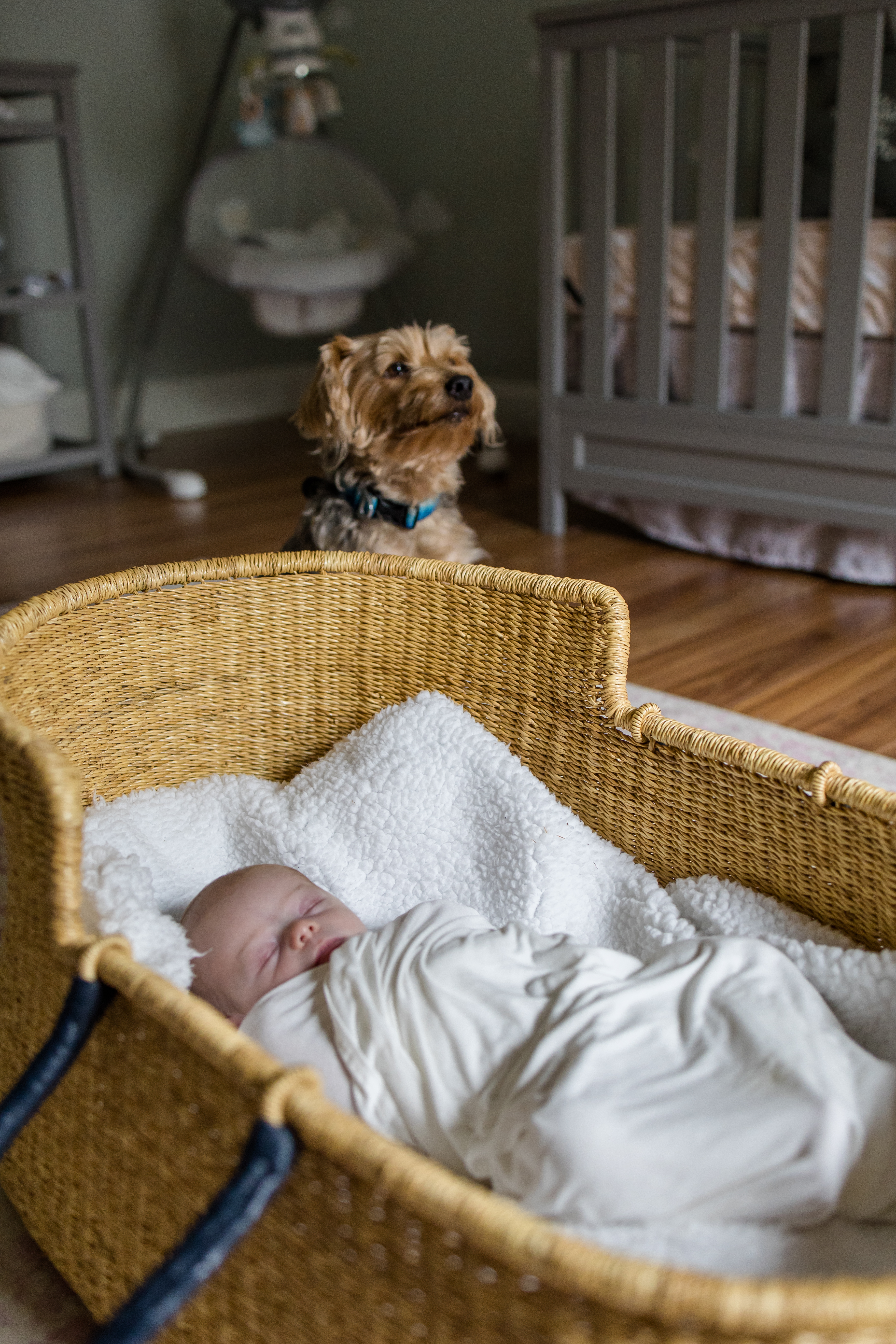 Black and white drawing of a dog watching over a sleeping baby in a bassinet.
