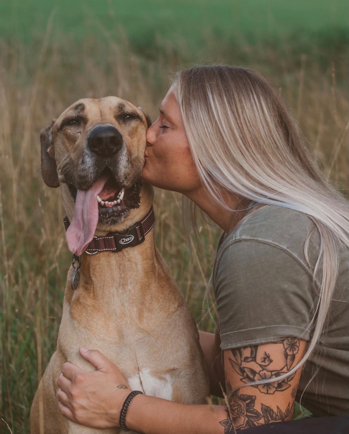 Painting of a blonde woman kissing her large tan dog.