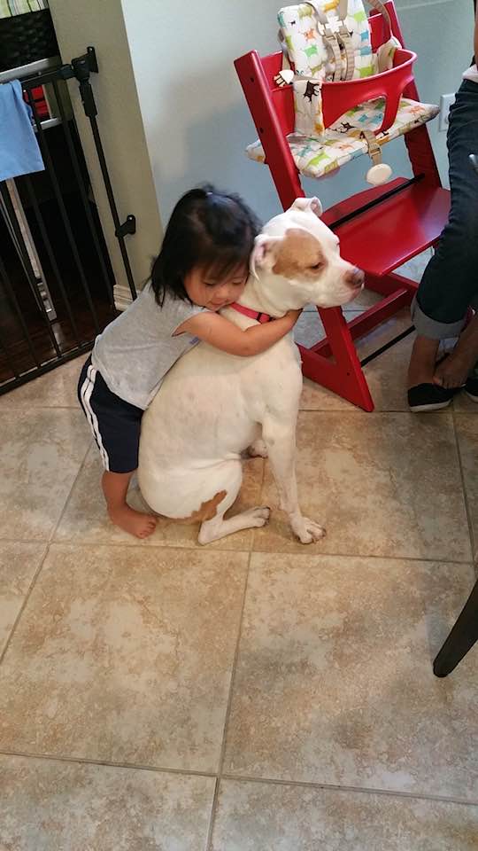 Painting of a young girl hugging a large white dog.