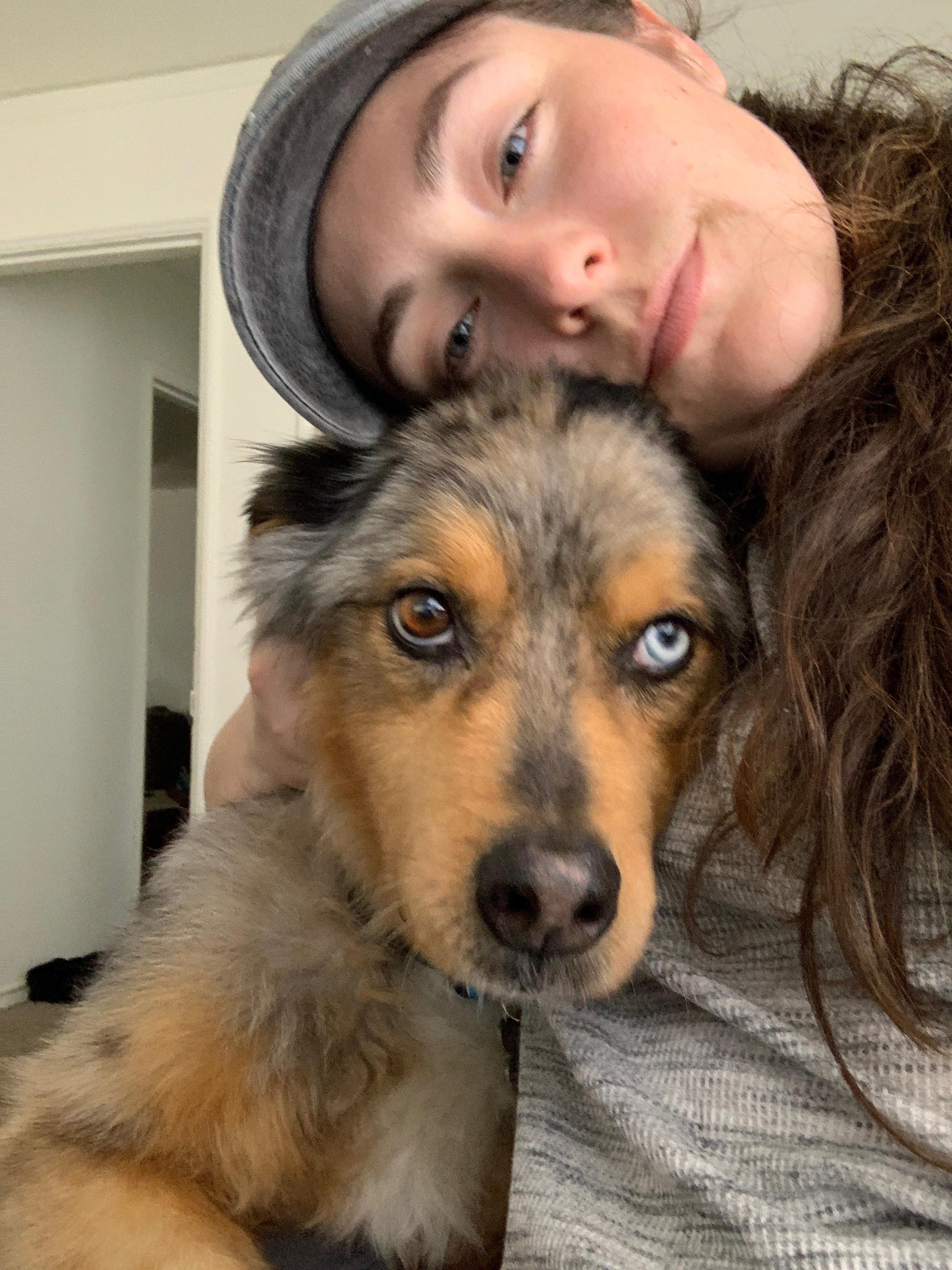 Painting of a woman and her dog cuddling.