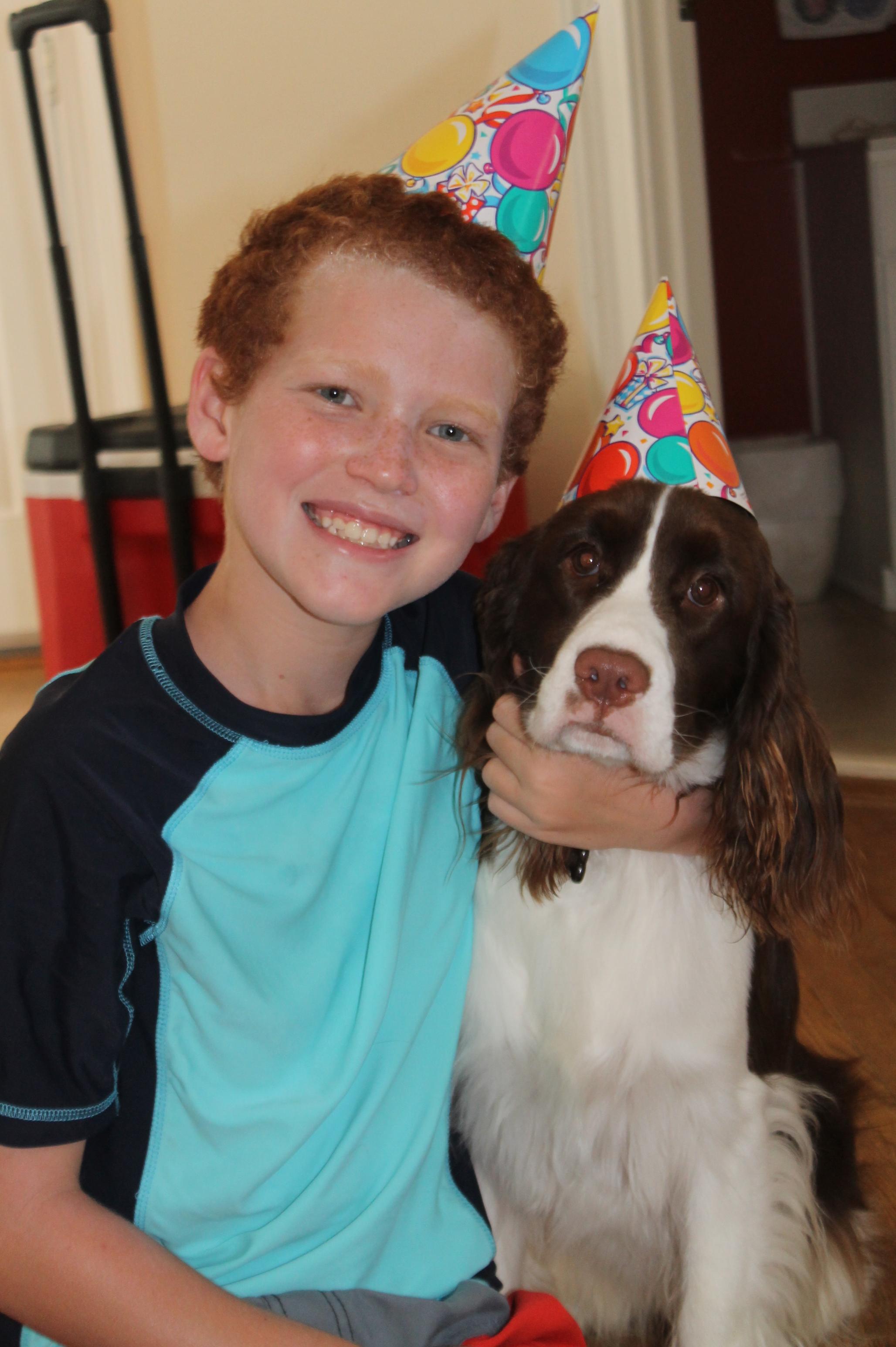 Painting of a boy hugging his Springer Spaniel.