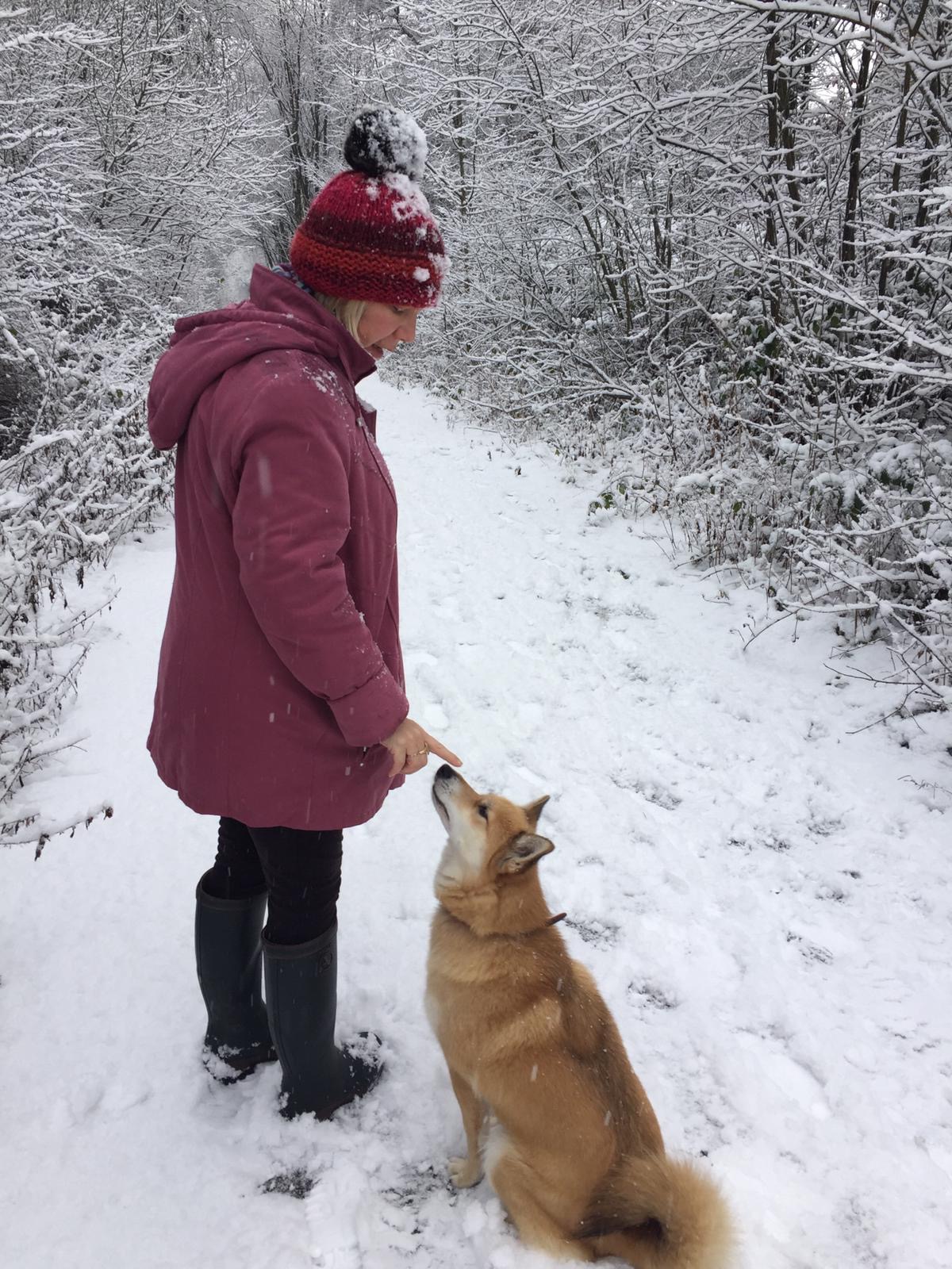 Woman in red coat and snow-covered hat interacting with a dog in a snowy landscape.