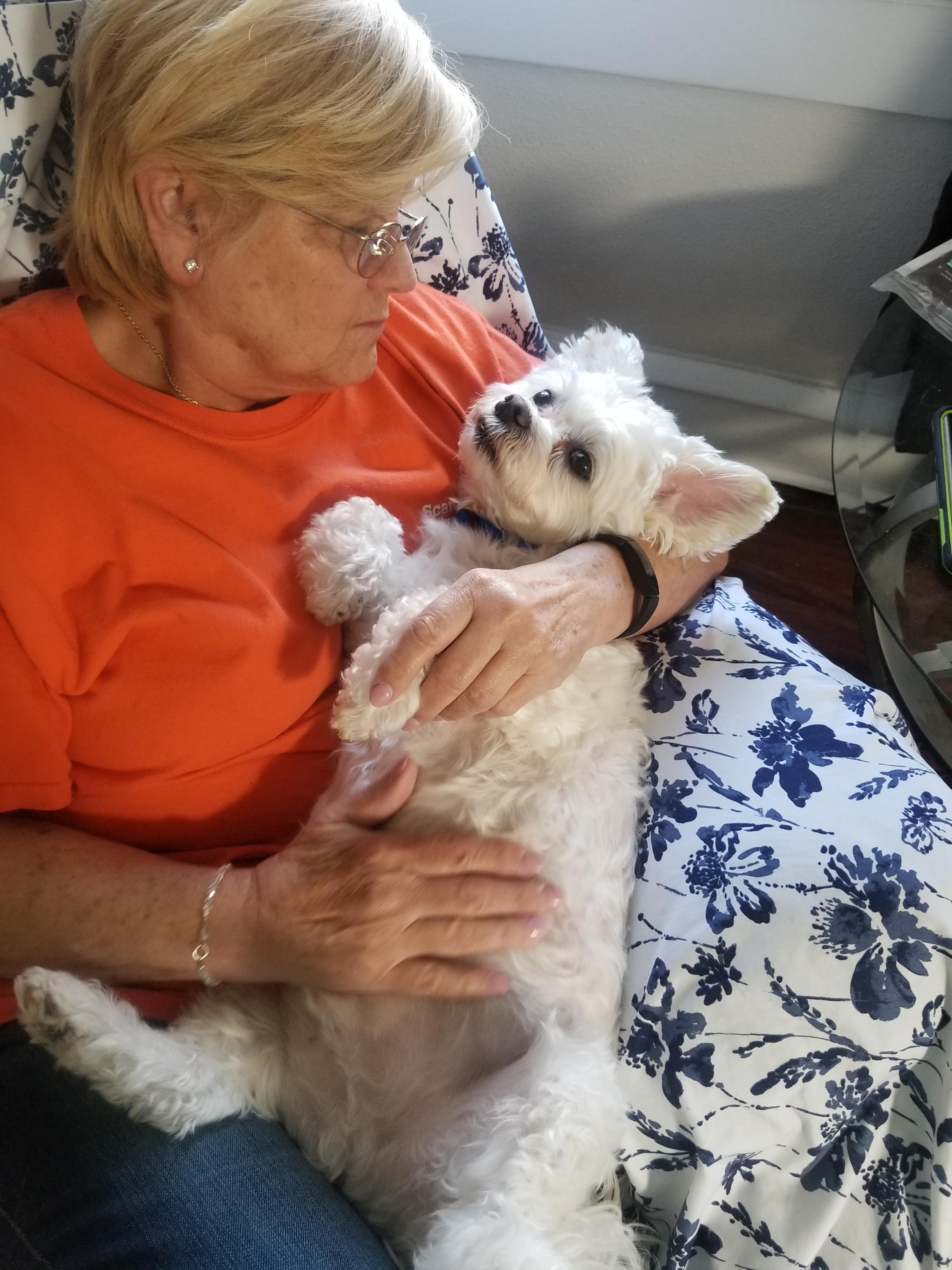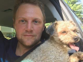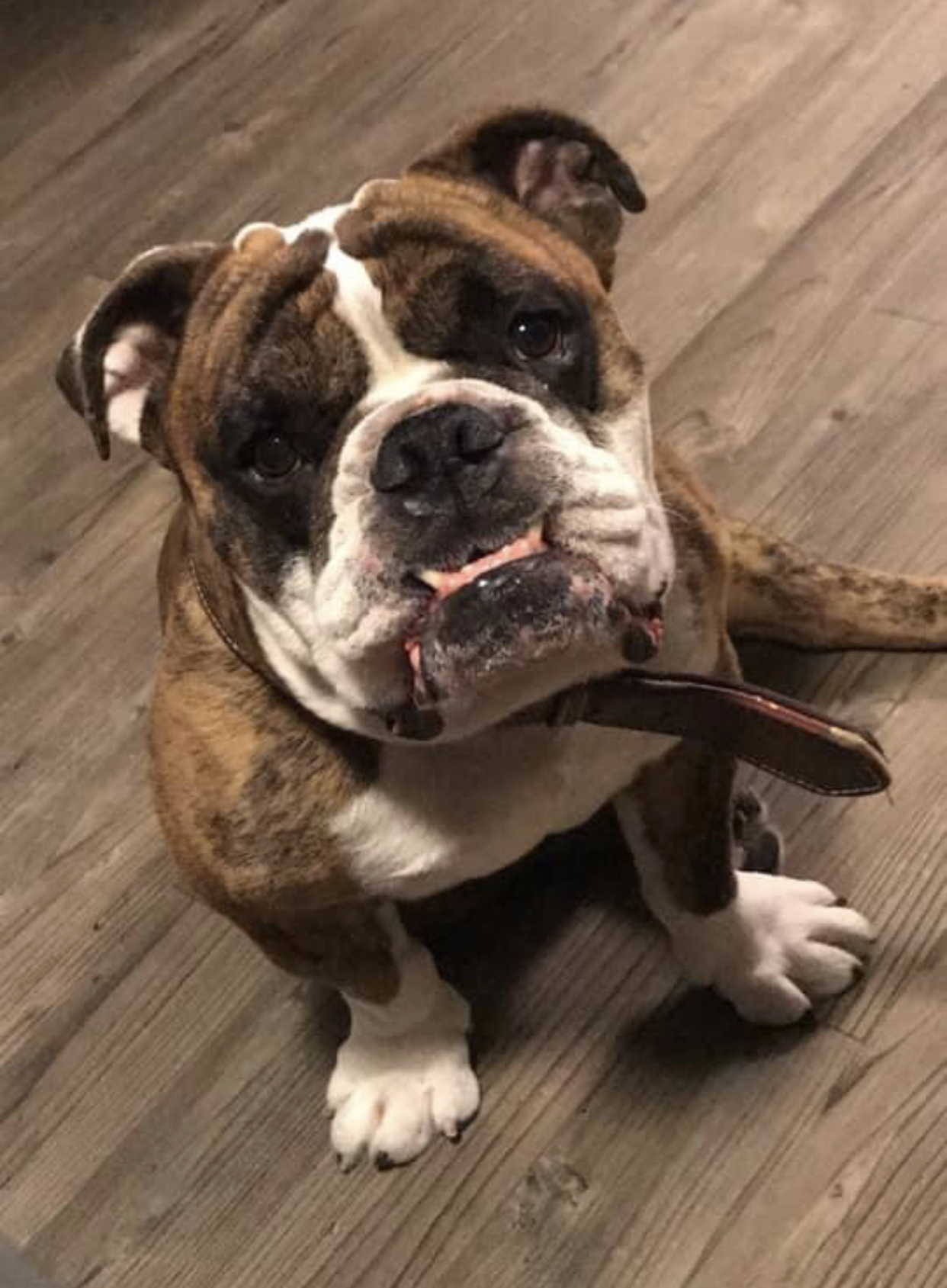 Painting of a smiling bearded man in a patriotic tank top holding a bulldog.