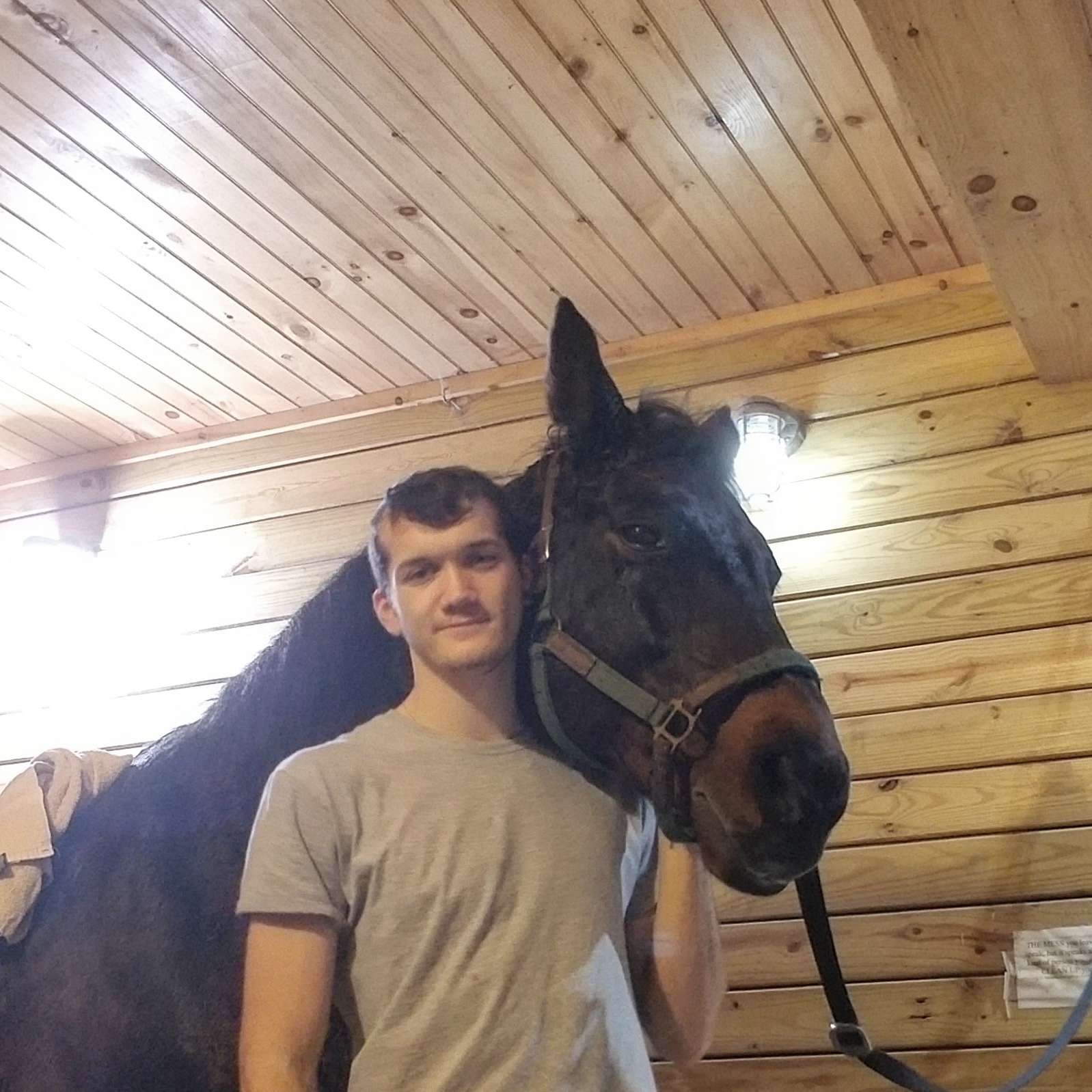 Painting of a young man with a black horse`s head resting on his shoulder.