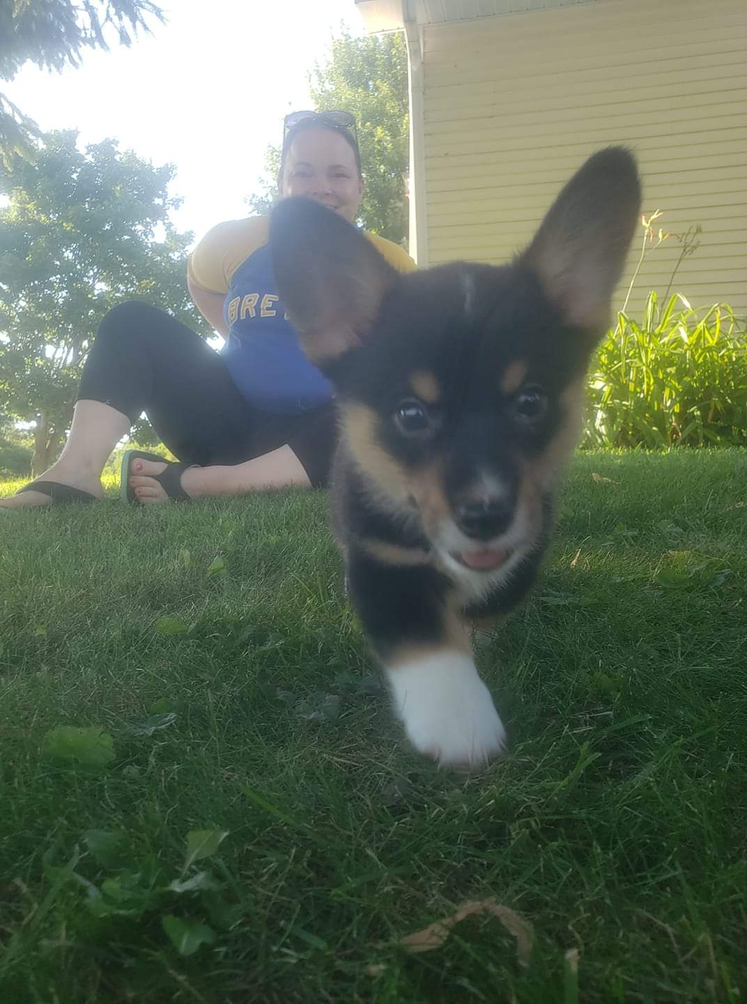 Color pencil drawing of a woman and her corgi puppy in a yard.