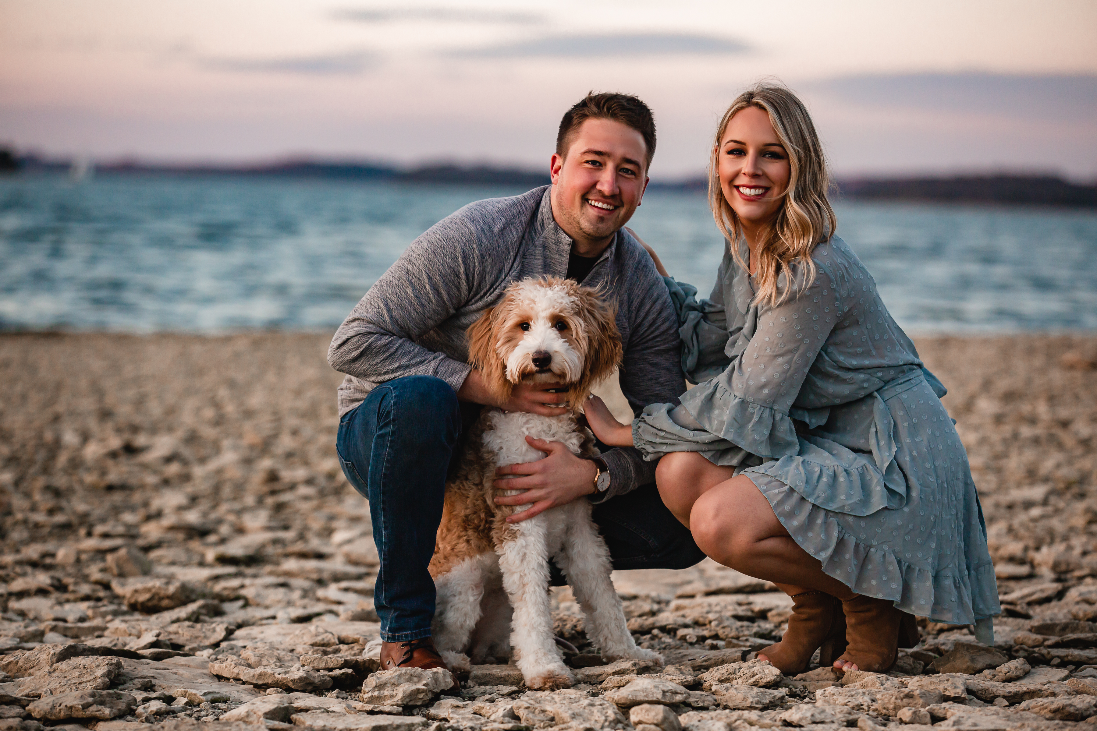 Painted portrait of a couple and their dog by a lake.