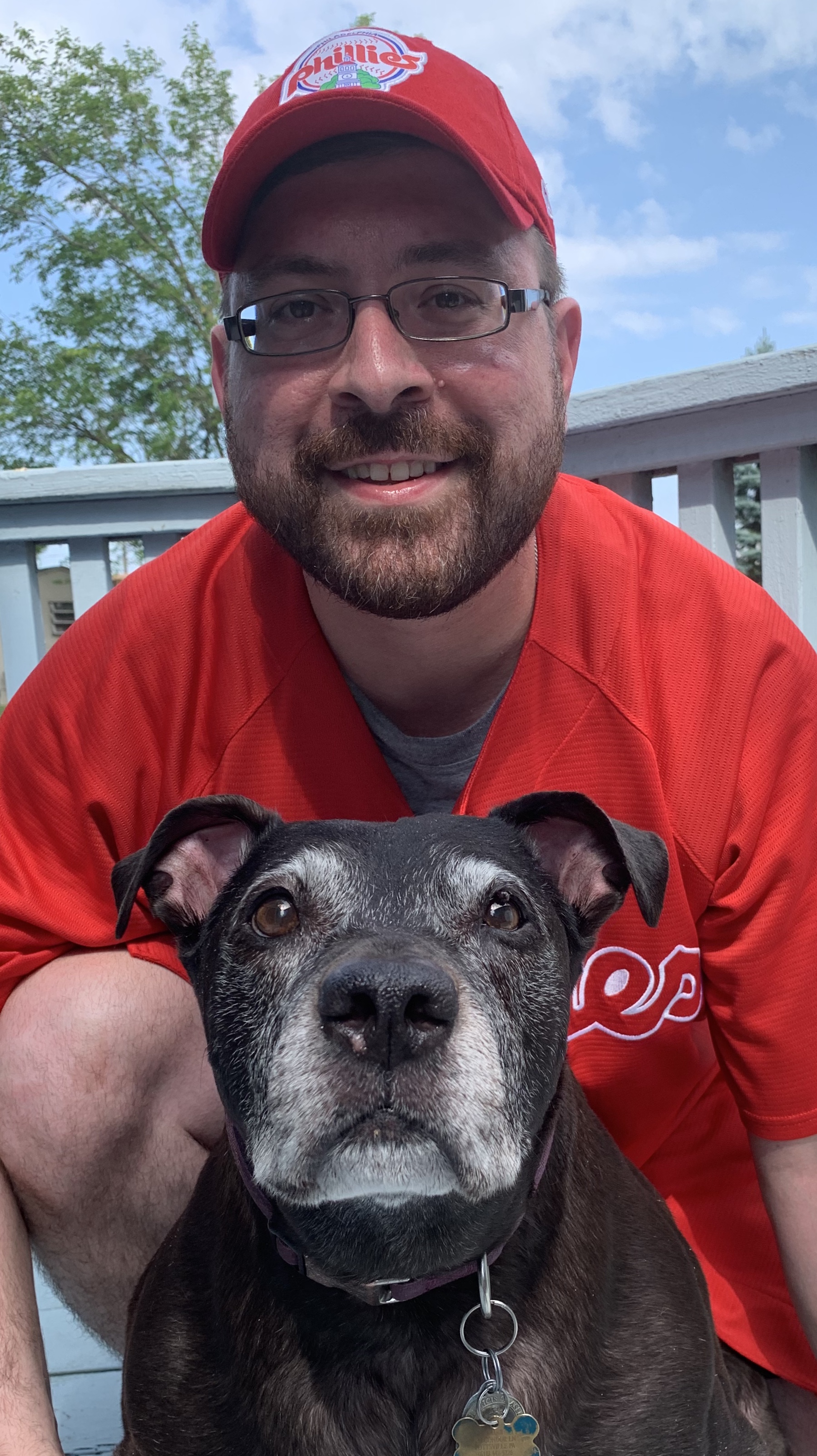 Painting of a man in a red shirt and baseball cap with his black dog.