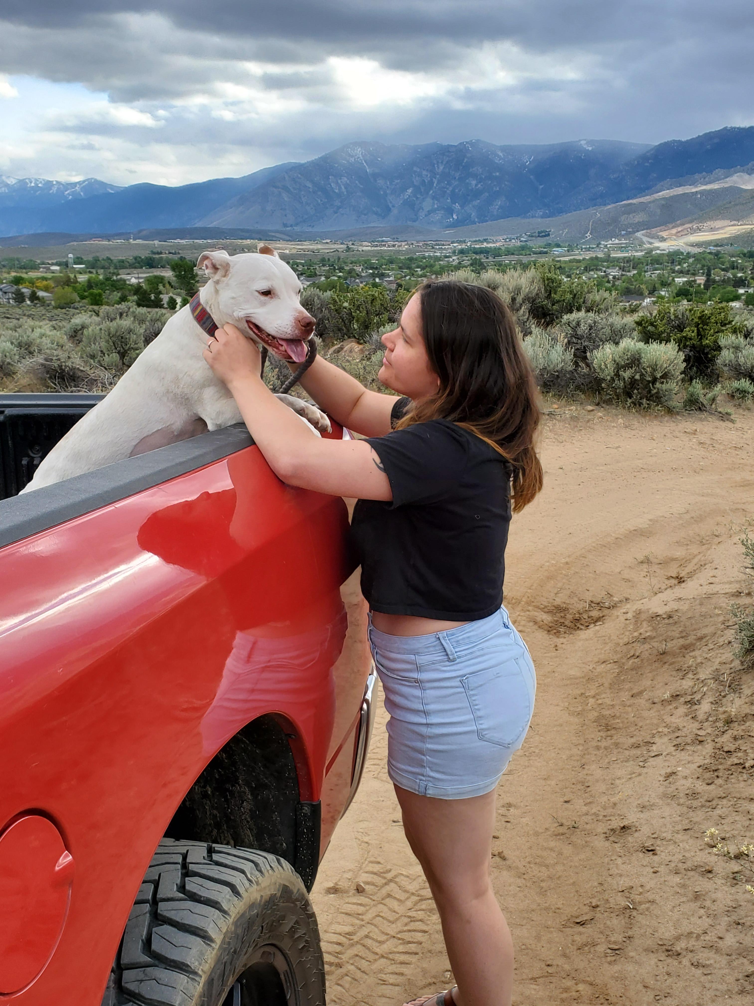 Painting of a woman petting a white pit bull on the back of a red truck.
