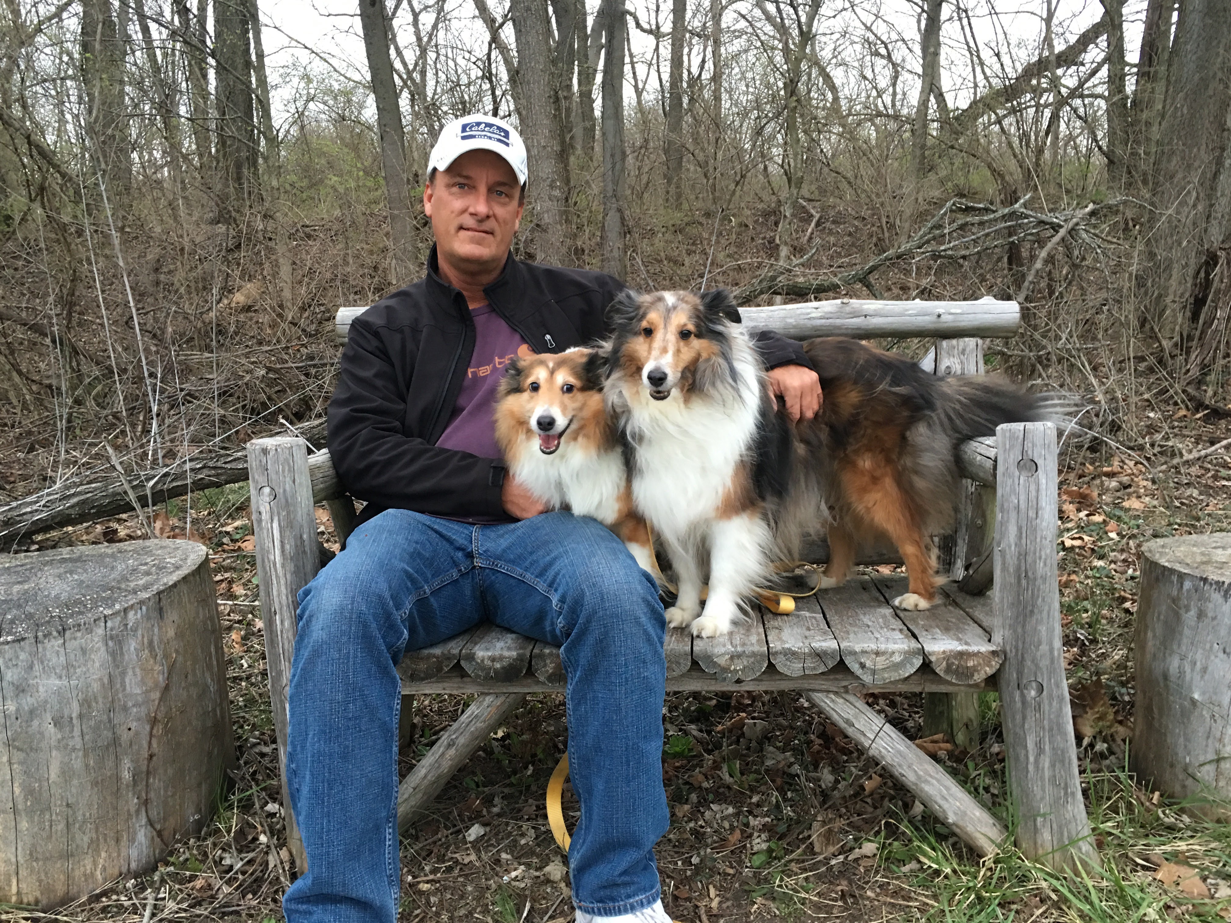 Painting of a man sitting on a bench with two Shetland Sheepdogs.