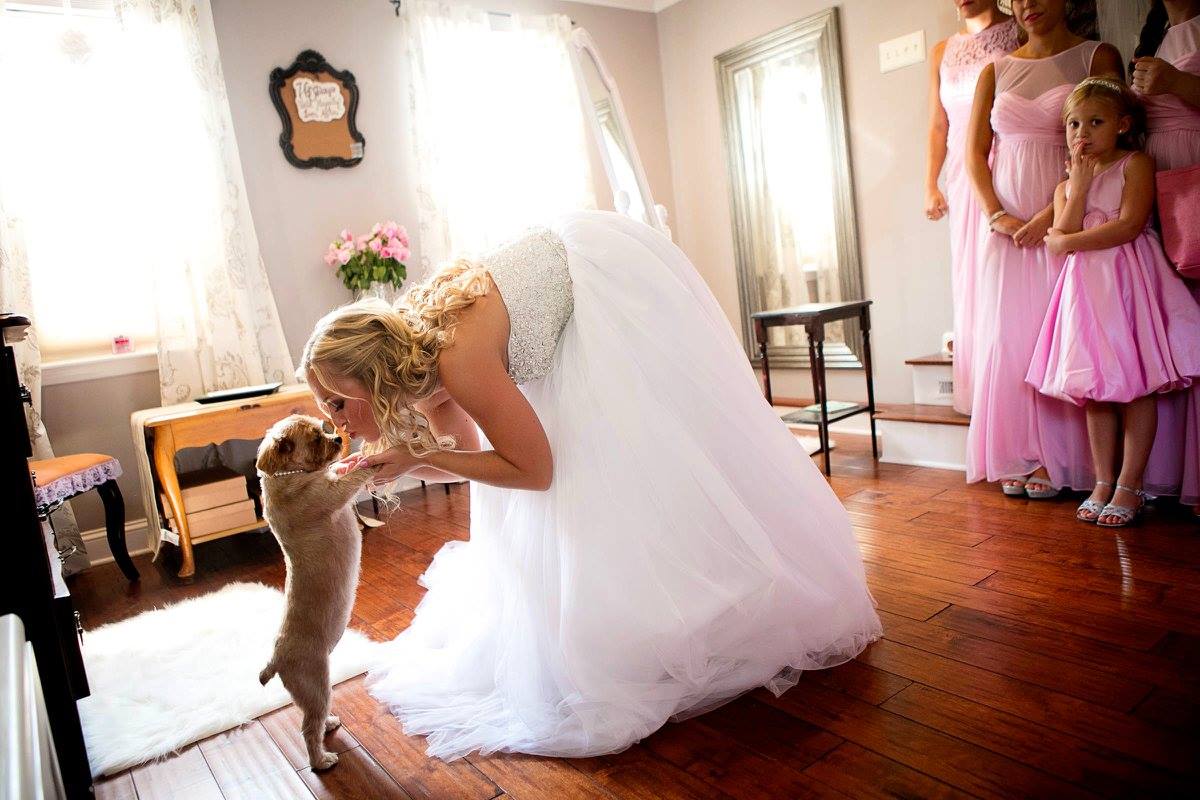 Bride in white dress kissing a puppy in front of a stone building.