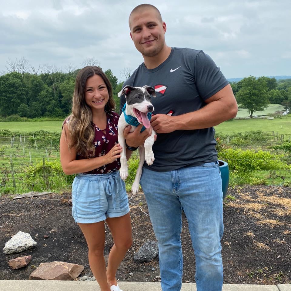Painted portrait of a couple and their dog.