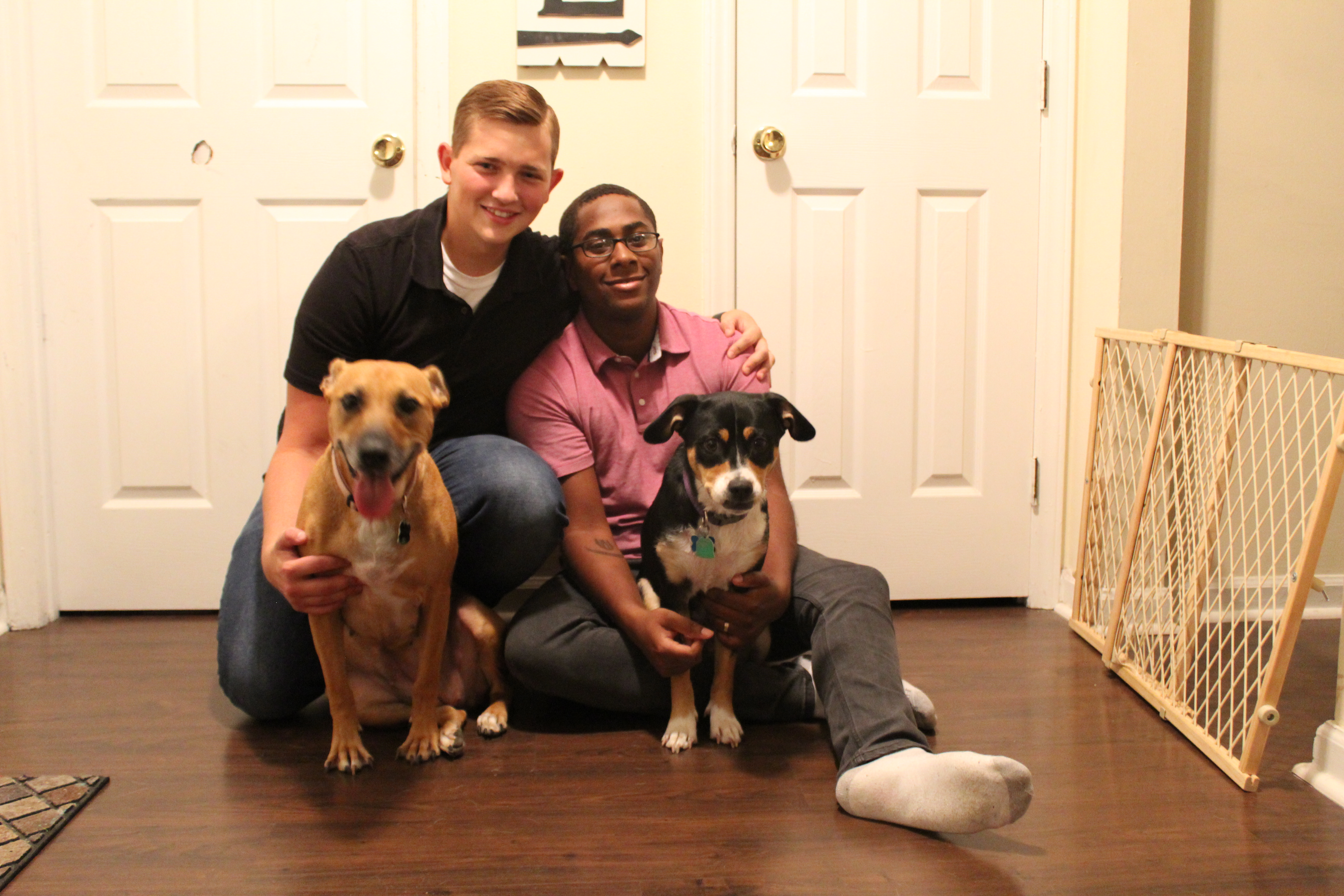 Painting of two men and two dogs sitting on a floor.