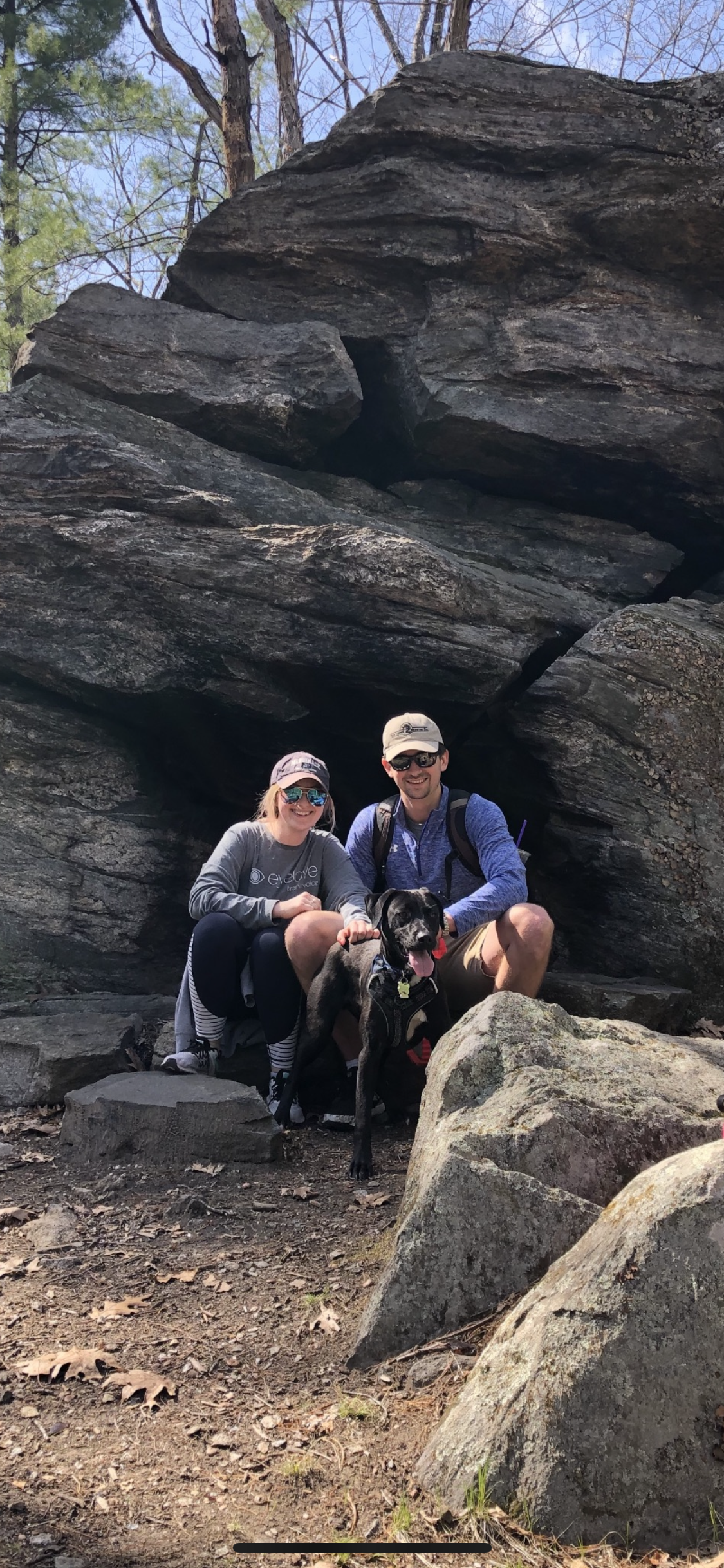 Painting of a couple and their dog sitting together outdoors.