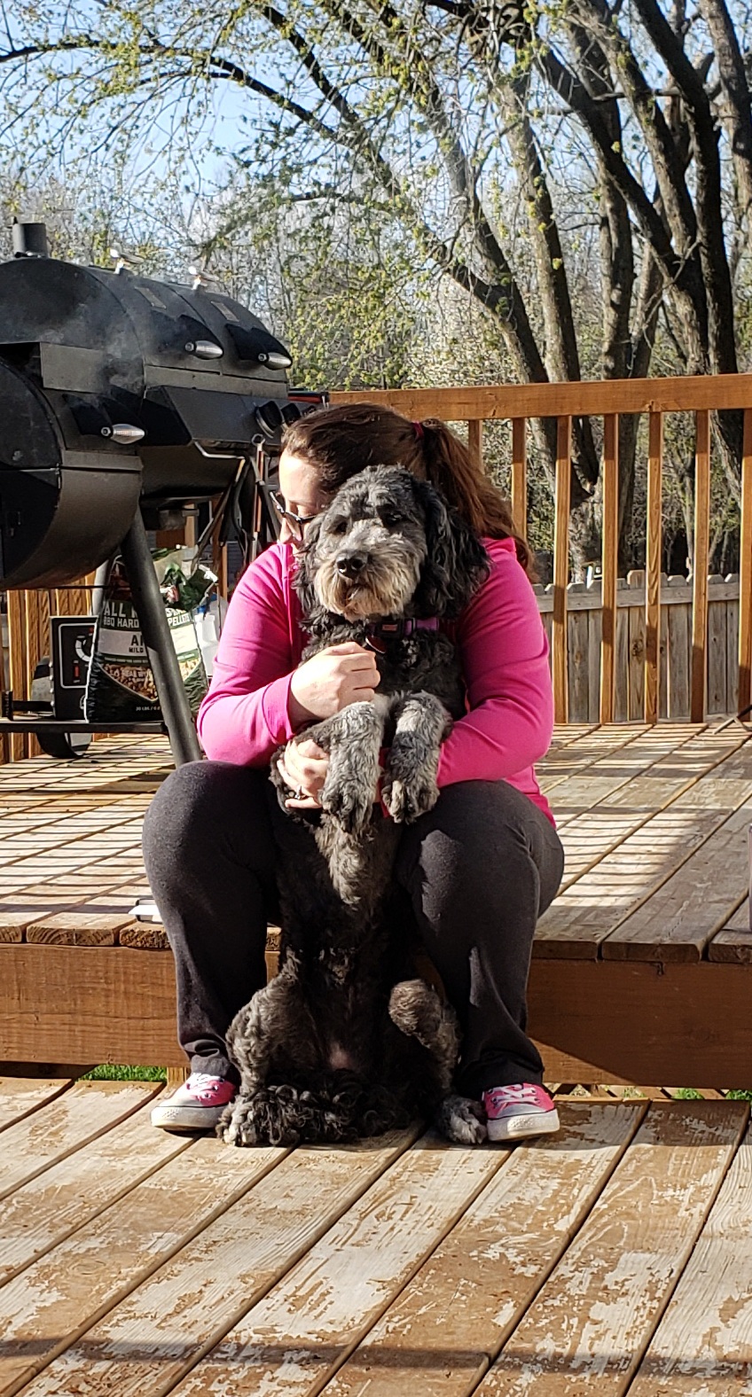 Painting of a woman hugging her gray dog outdoors