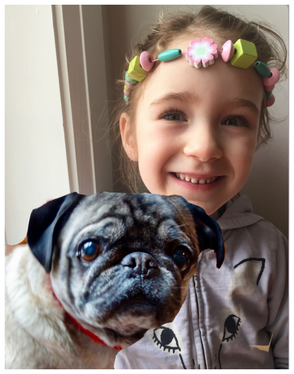 Smiling girl wearing a candy necklace embraces her pug, ocean in background.
