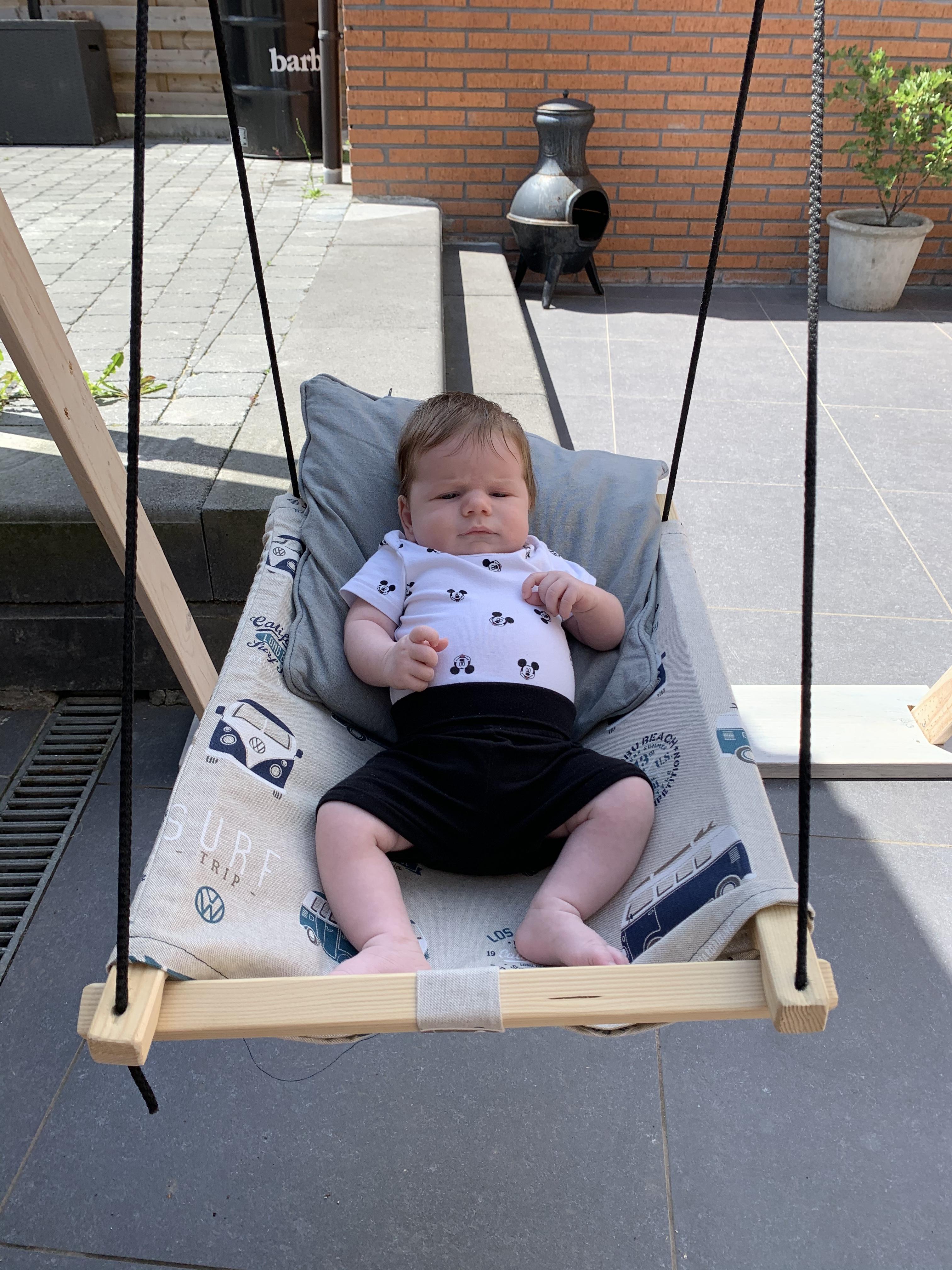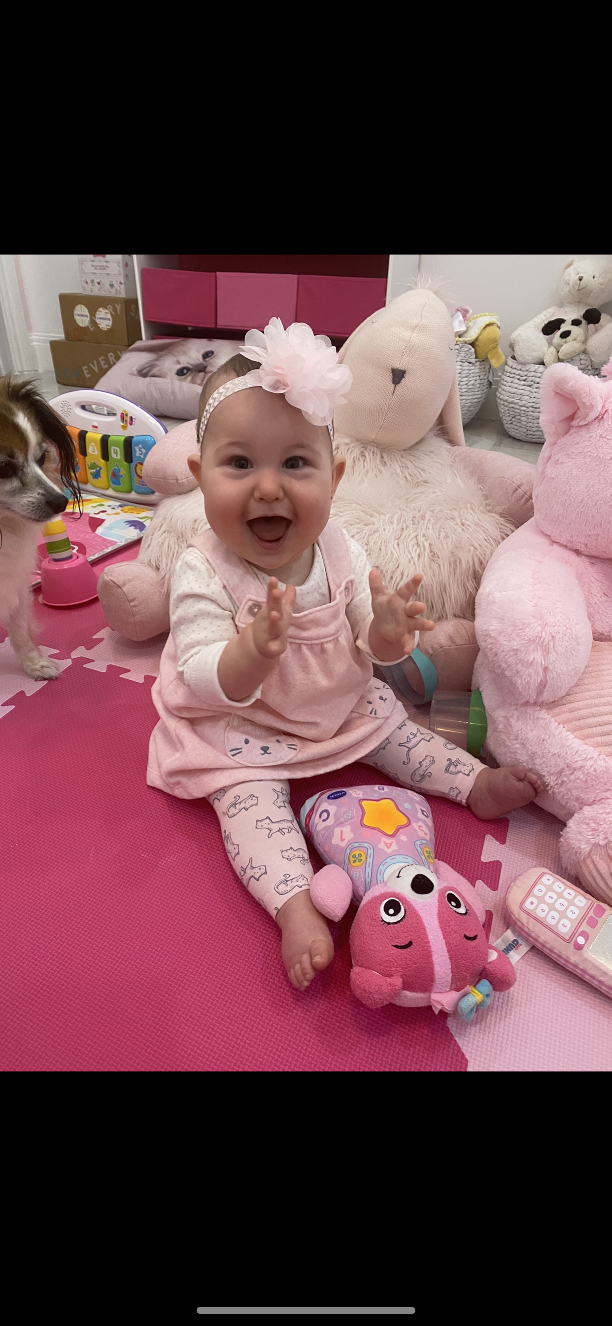 Painting of a laughing baby girl with a small dog, playing with a toy.