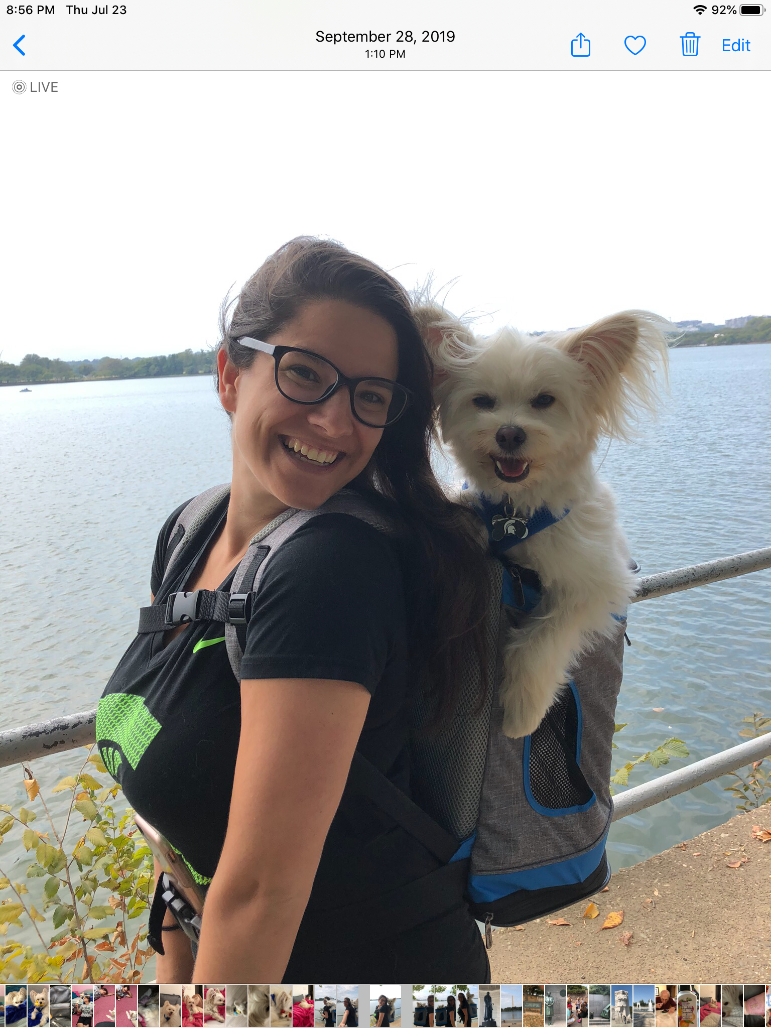 Painting of a smiling woman wearing glasses and a backpack with a small white dog in it.