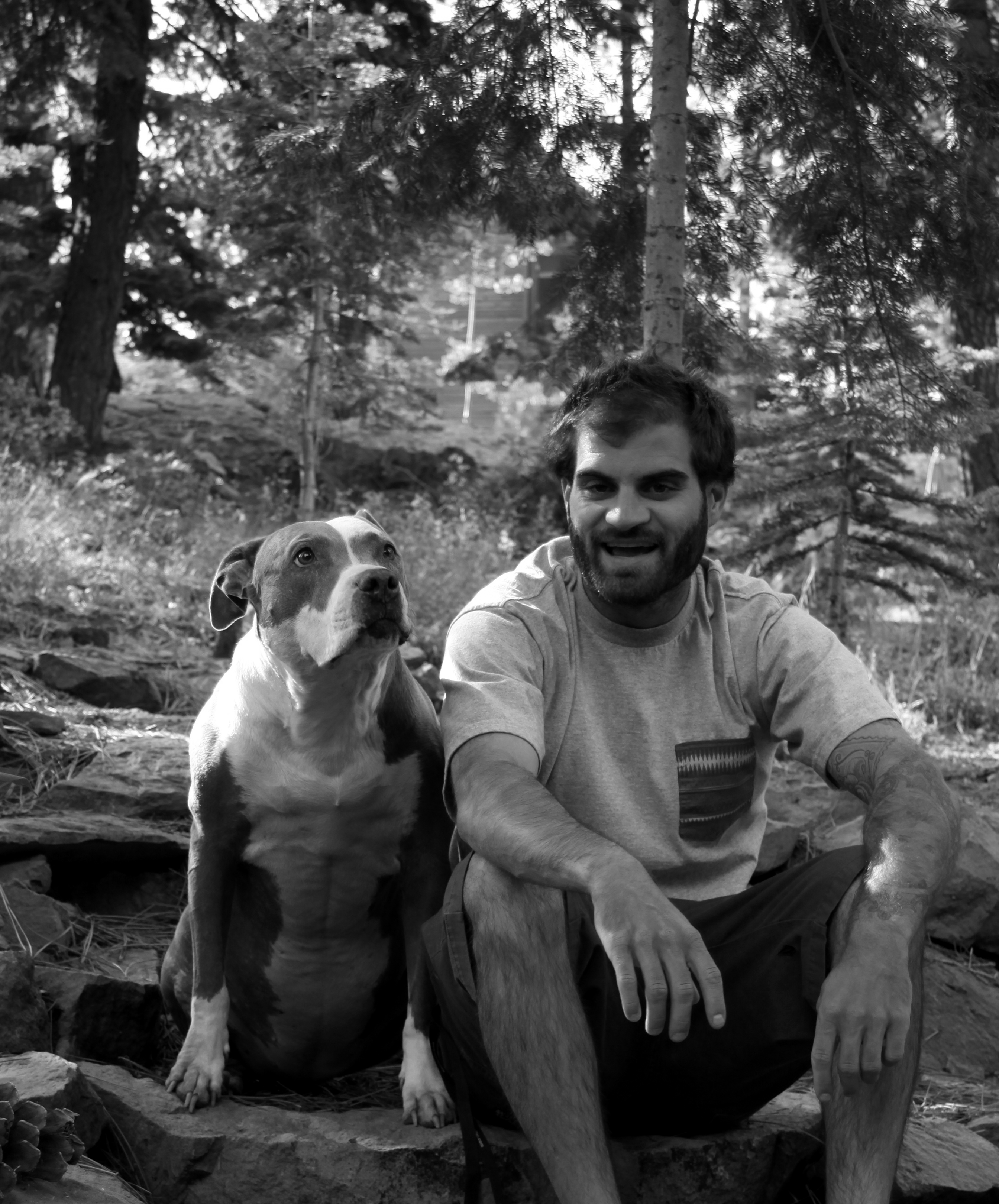 Black and white pencil sketch of a man and his dog sitting outdoors.