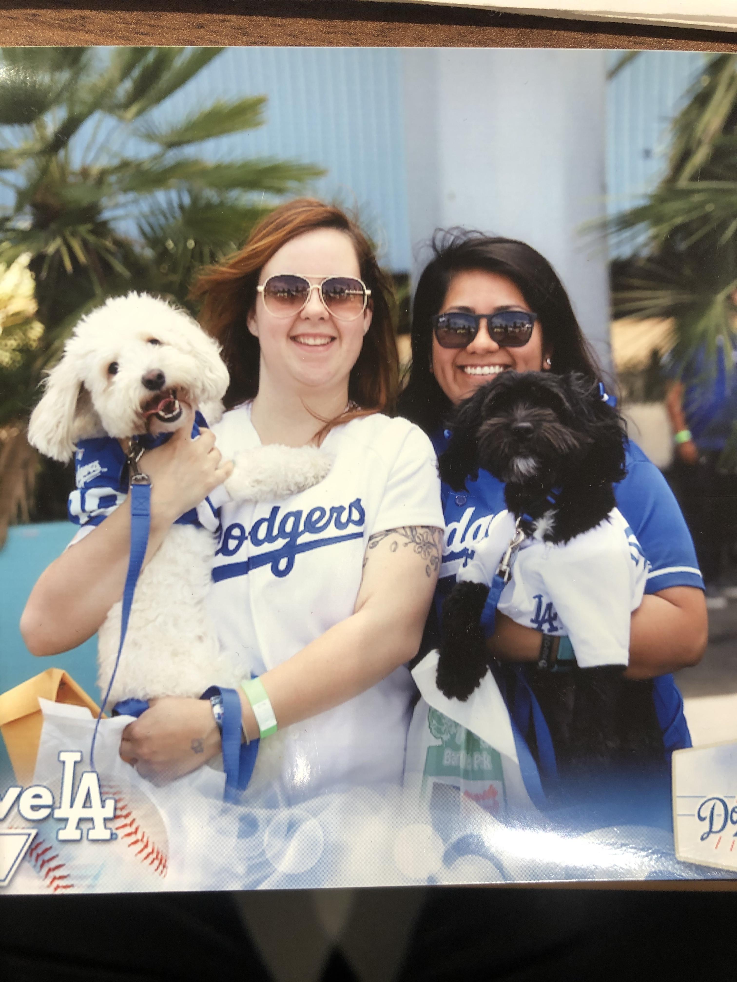 Painting of two women wearing Dodgers shirts and holding small dogs.