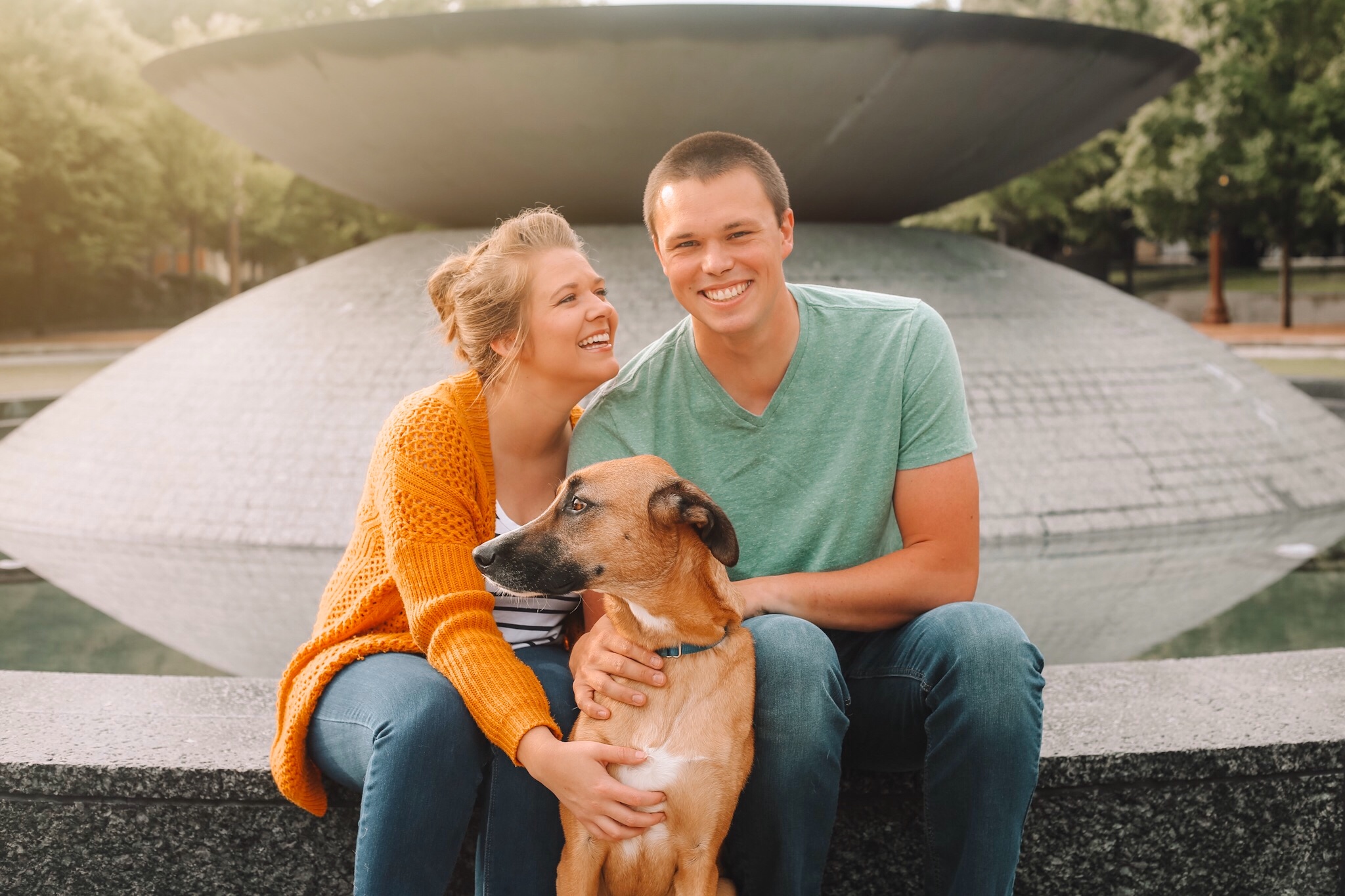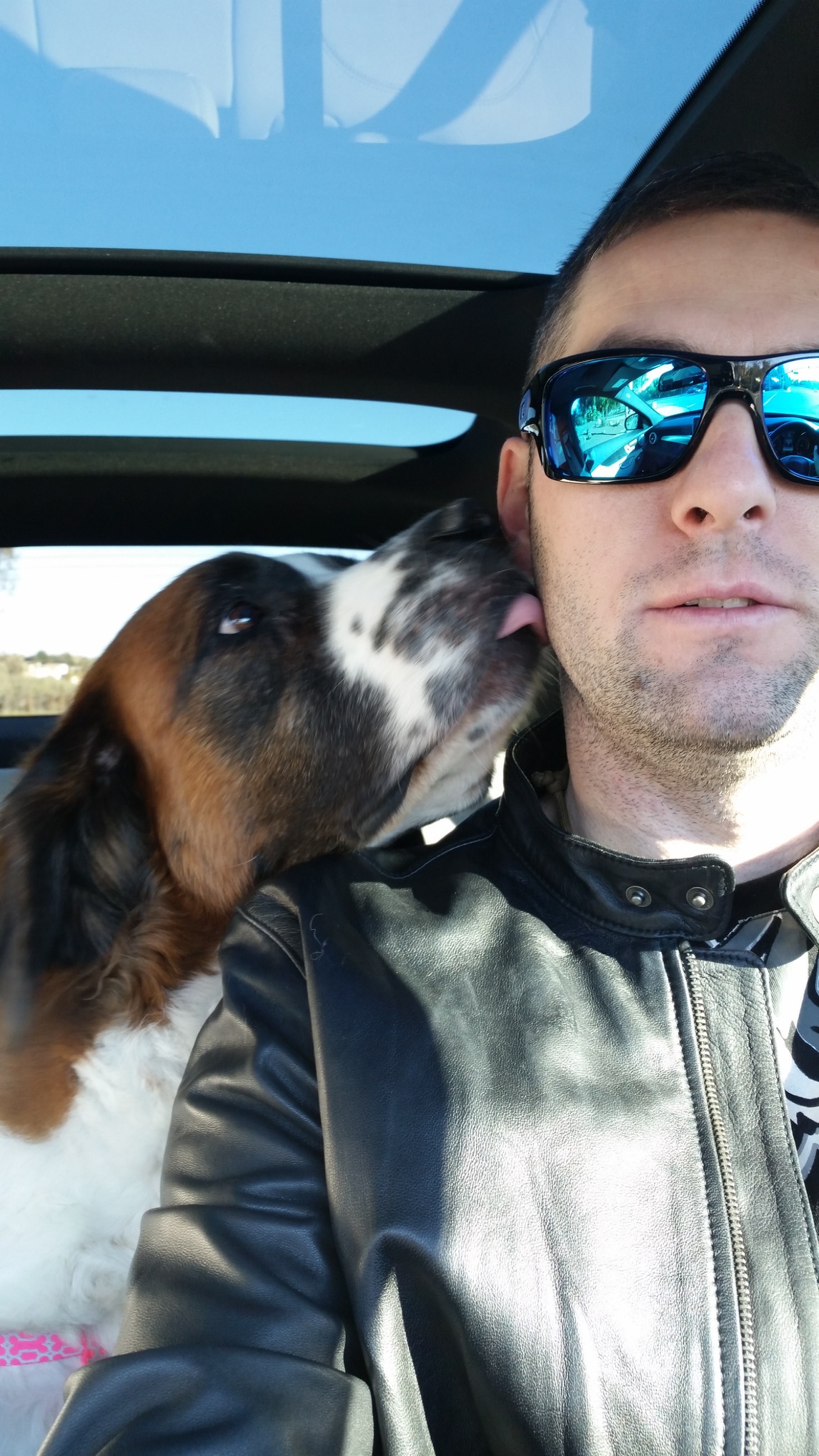 Oil painting of a man wearing sunglasses with a dog licking his cheek.