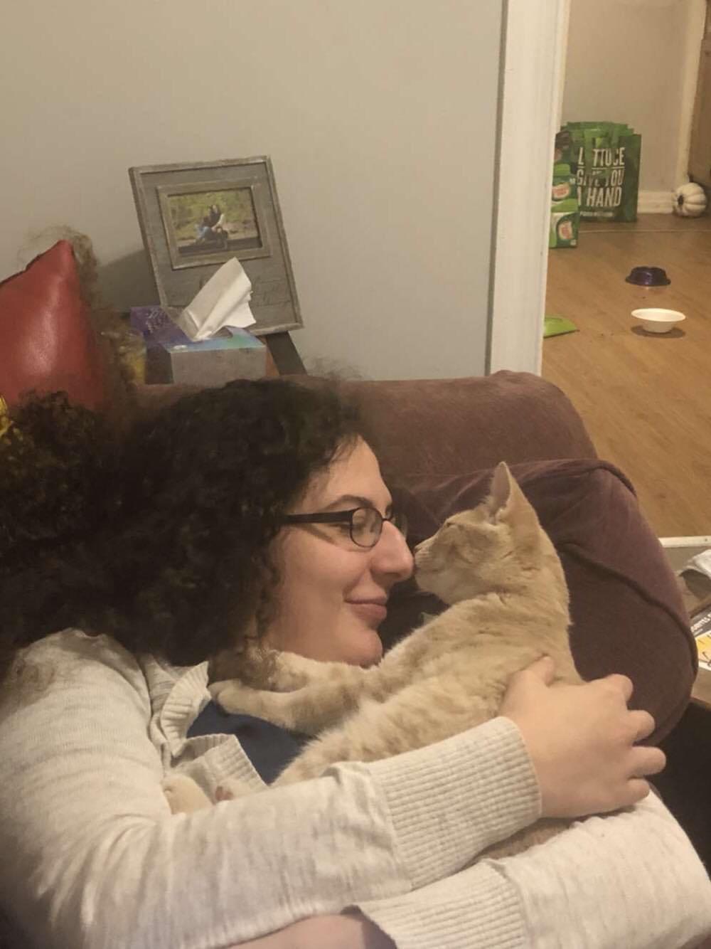 Painting of a woman with her pets: a black kitten, a dog, a gray cat, a cream-colored cat, and a black cat.