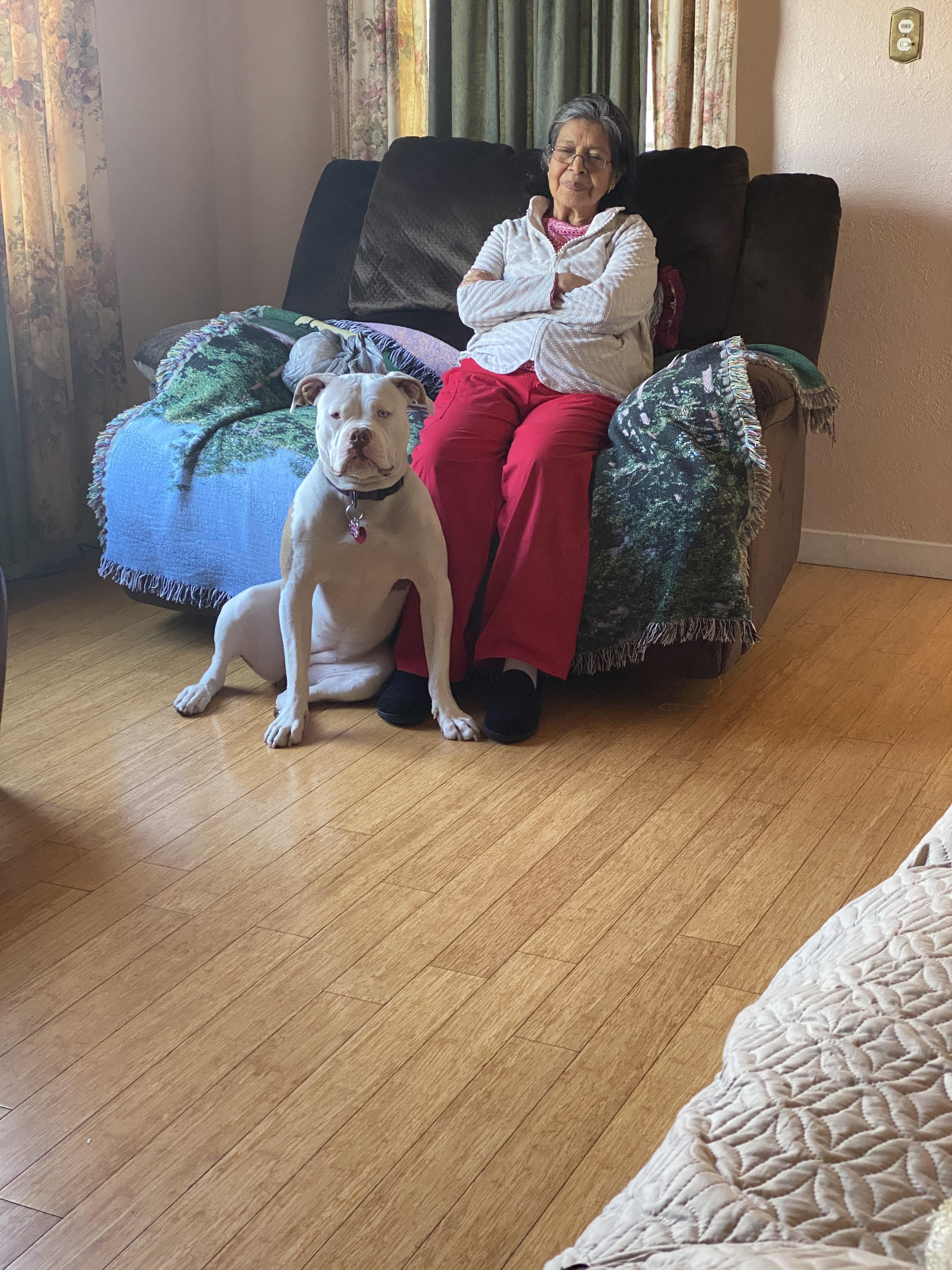 Painting of an elderly woman with her white American Bulldog sitting beside her on a couch.