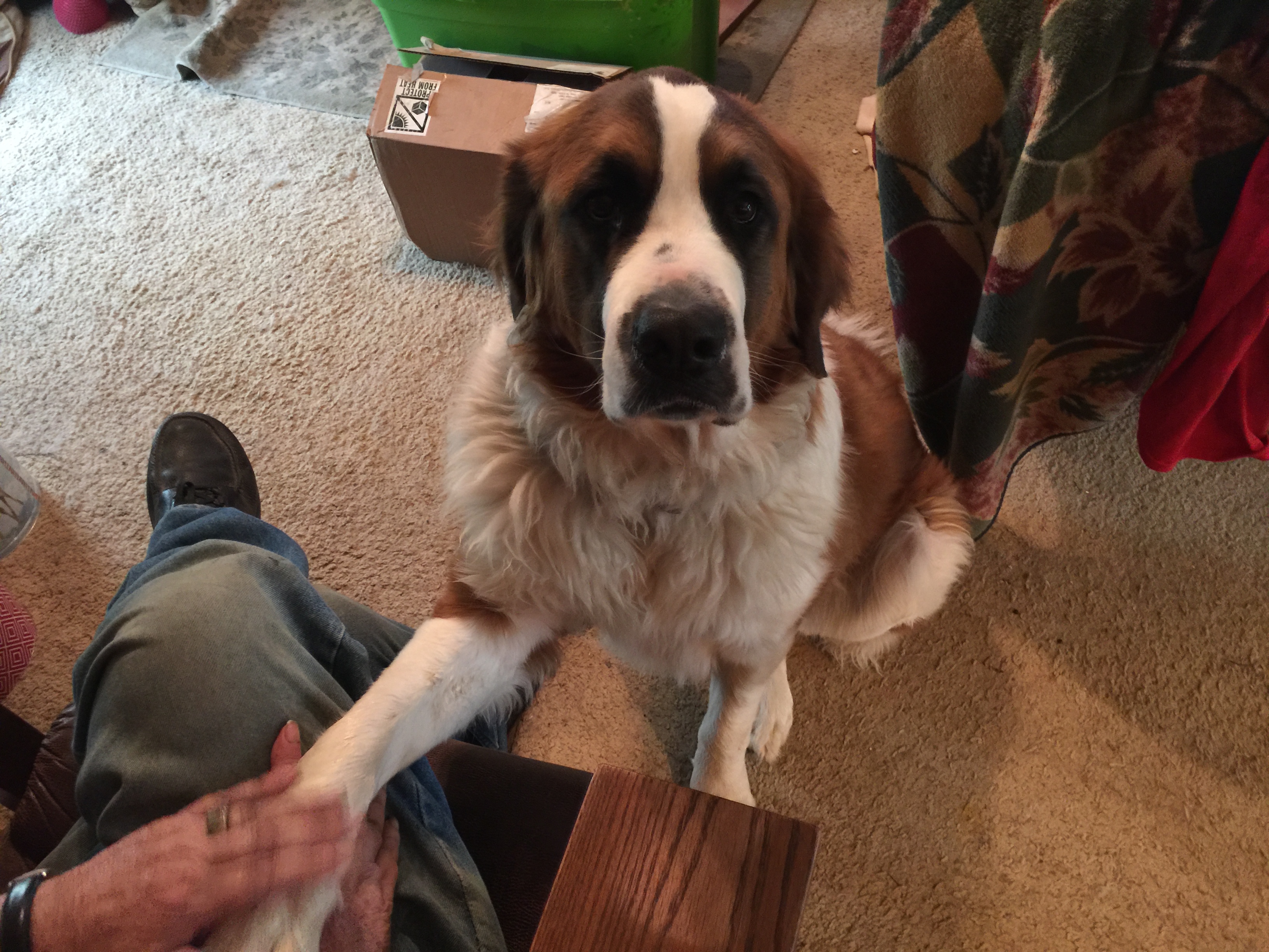 Painting of a Saint Bernard dog sitting on a wooden floor, offering its paw to a person.