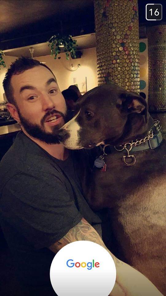 Painting of a man with tattoos hugging his dog.