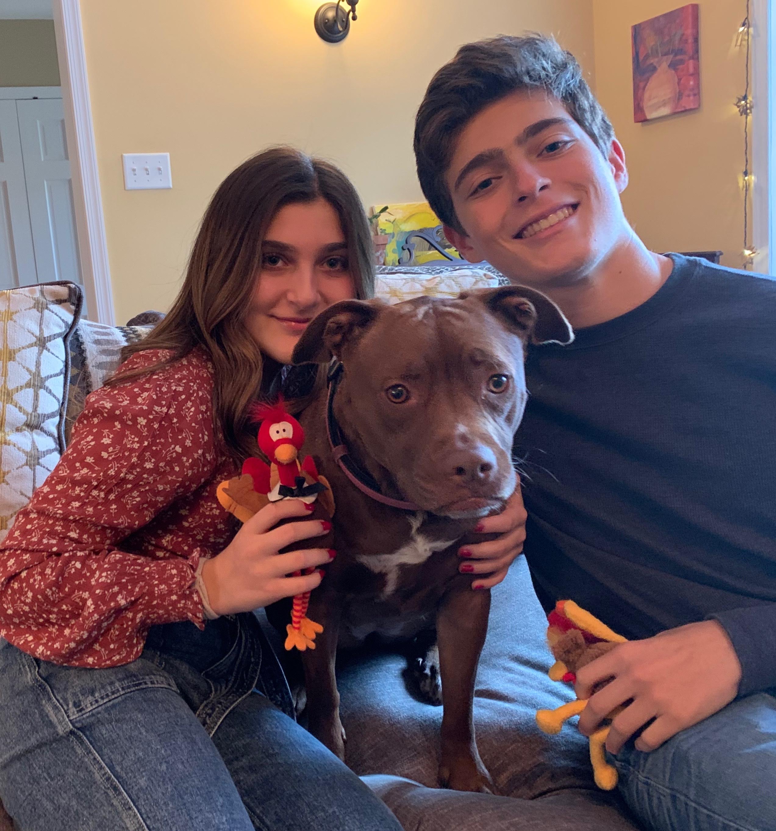 Oil painting of a teenage girl and boy with their dog.
