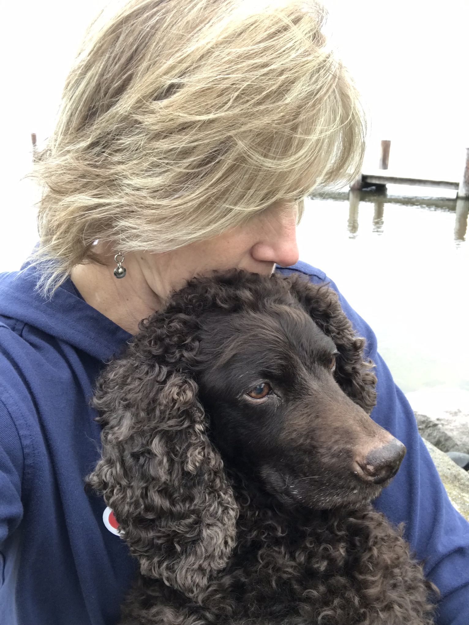 Portrait of a woman with blonde hair and a black dog, near a lake.