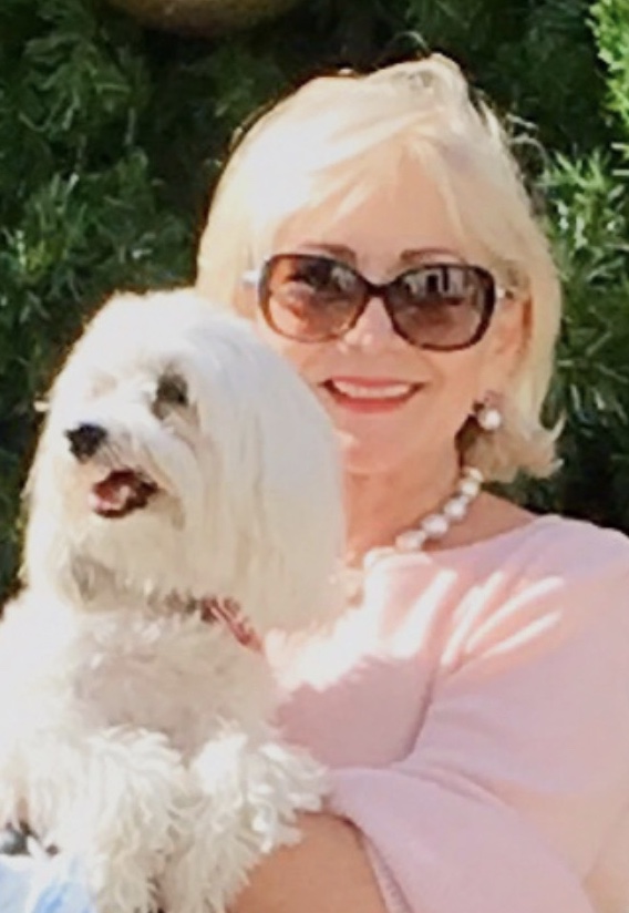 Portrait of a woman holding two small white fluffy dogs in a field of yellow flowers.