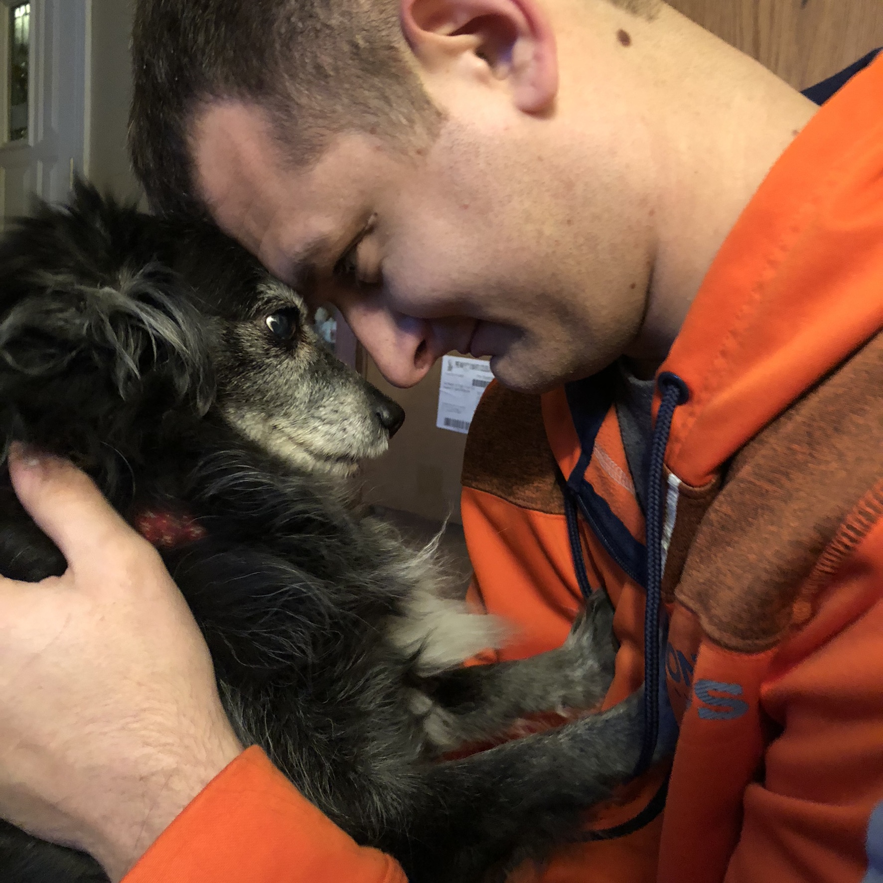 Painting of a man in an orange jacket nuzzling a black dog.