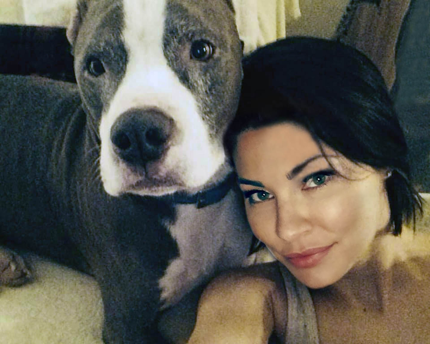 Painting of a woman and her pit bull.