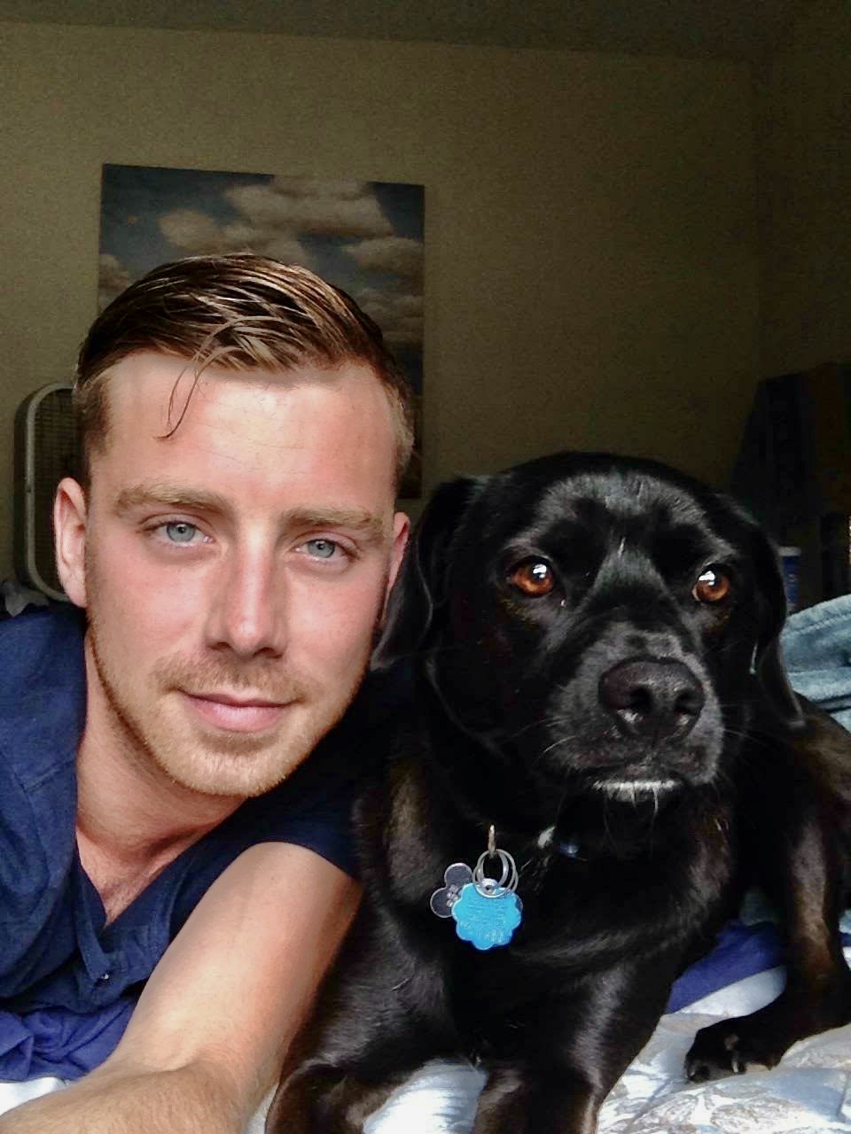 Oil painting of a man and his black dog.