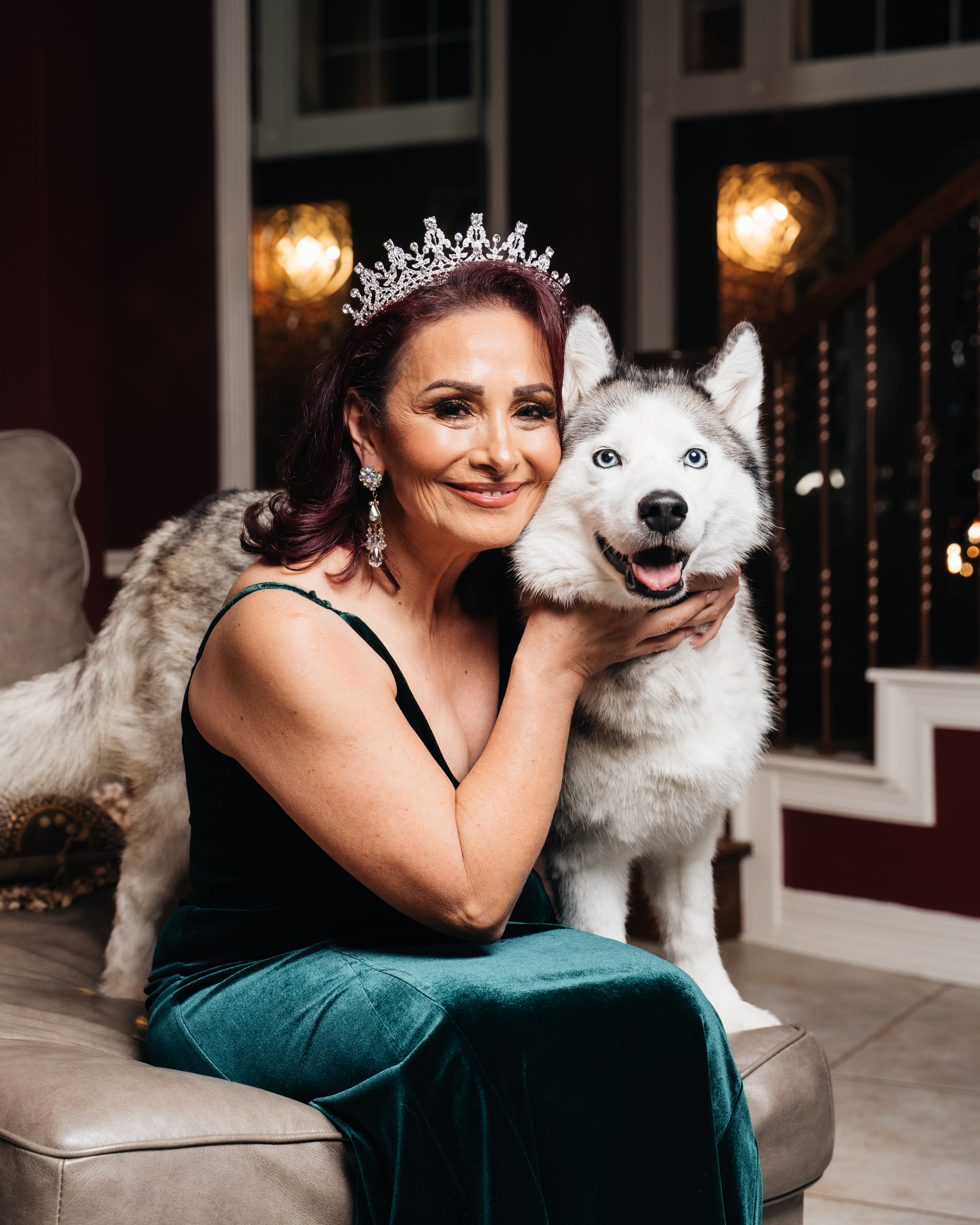 Painting of a woman wearing a tiara and teal gown embracing a husky dog.