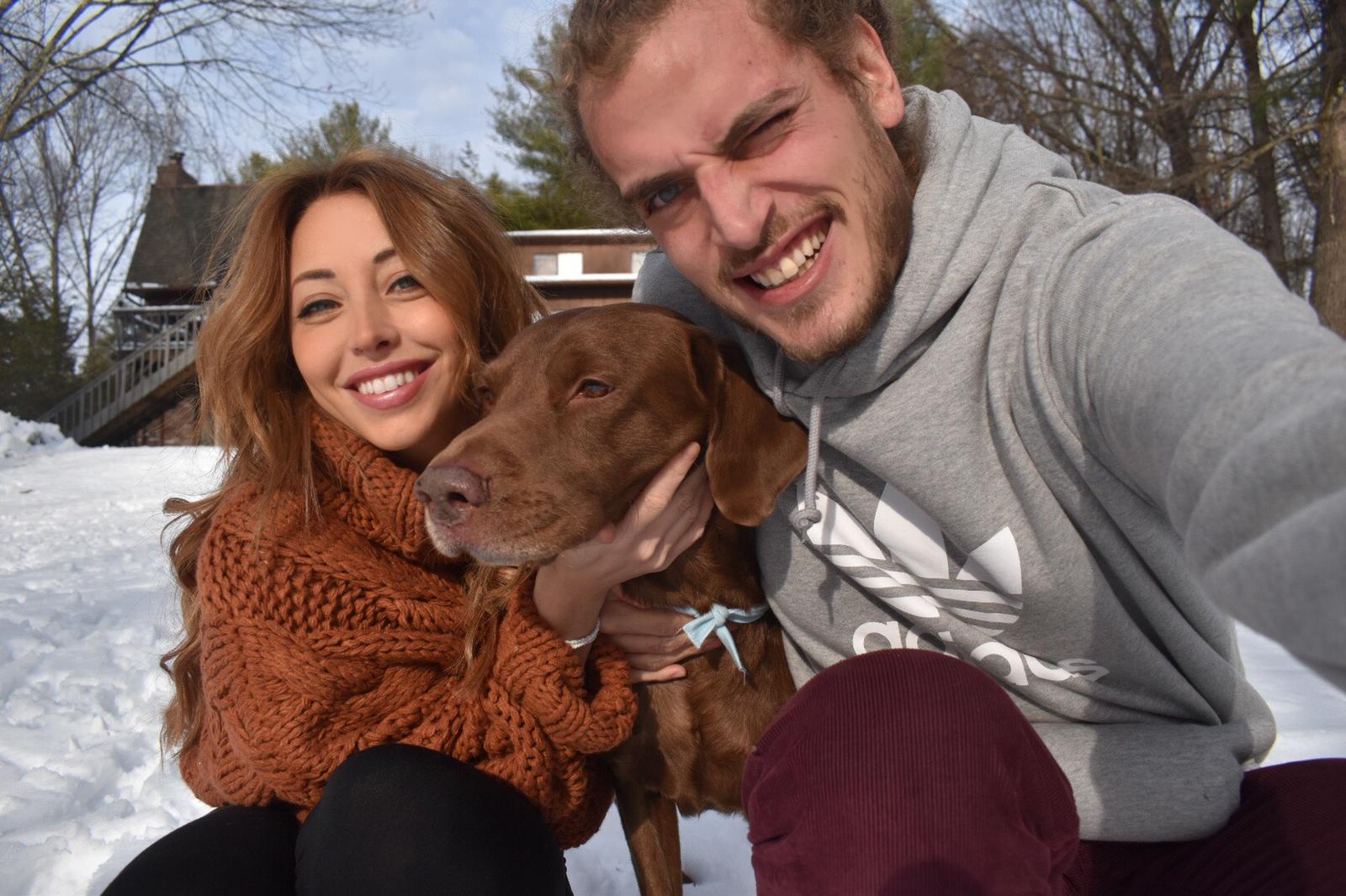 Painted portrait of a couple and their dog in winter setting.