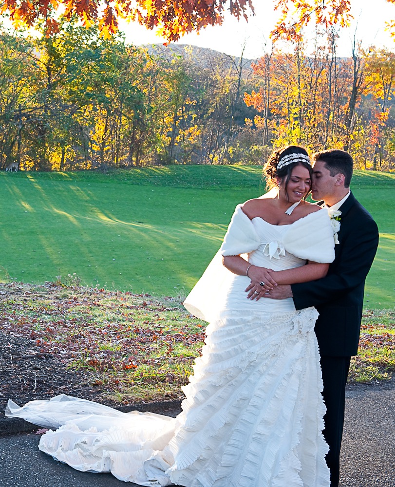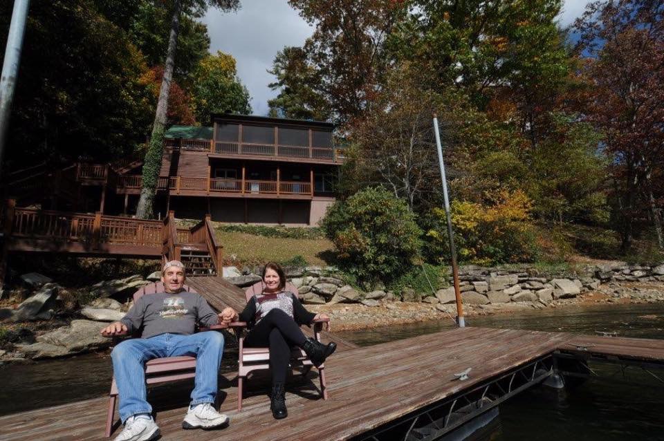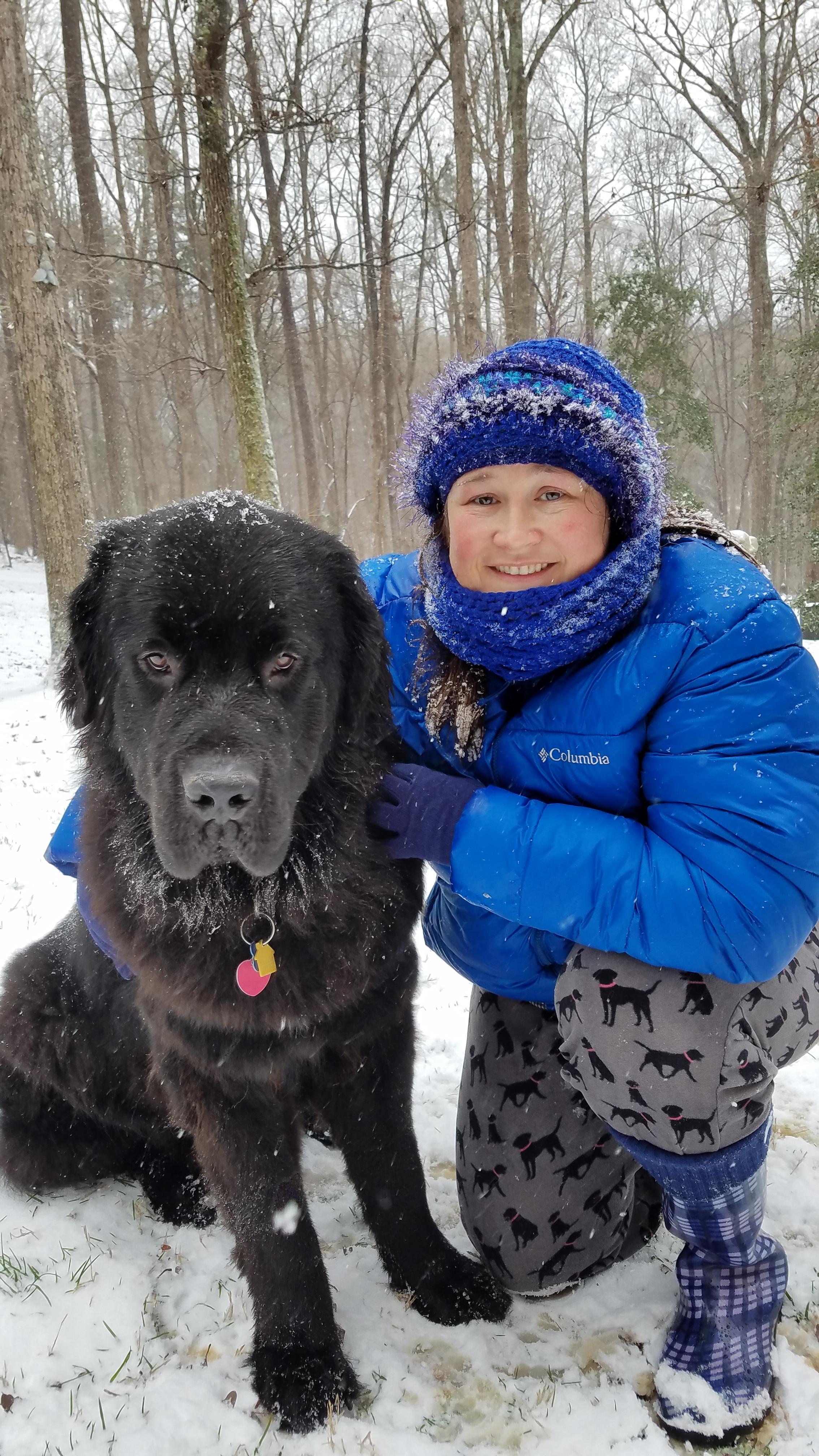 Painting of a man kneeling and hugging a white dog on a dock by a lake with autumn trees in the background.