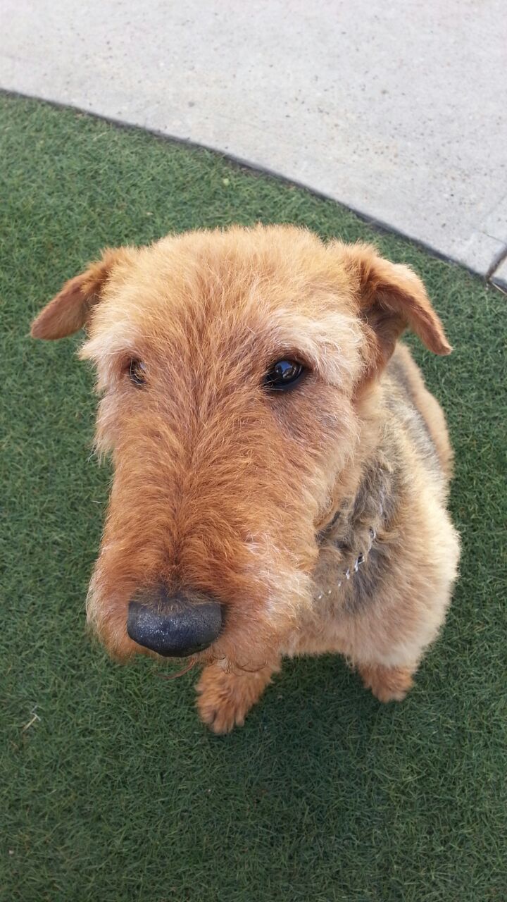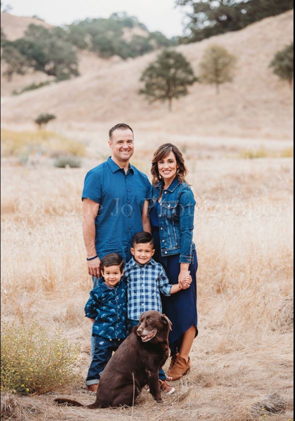 Family portrait painting: parents, two young sons, and chocolate lab in a field.