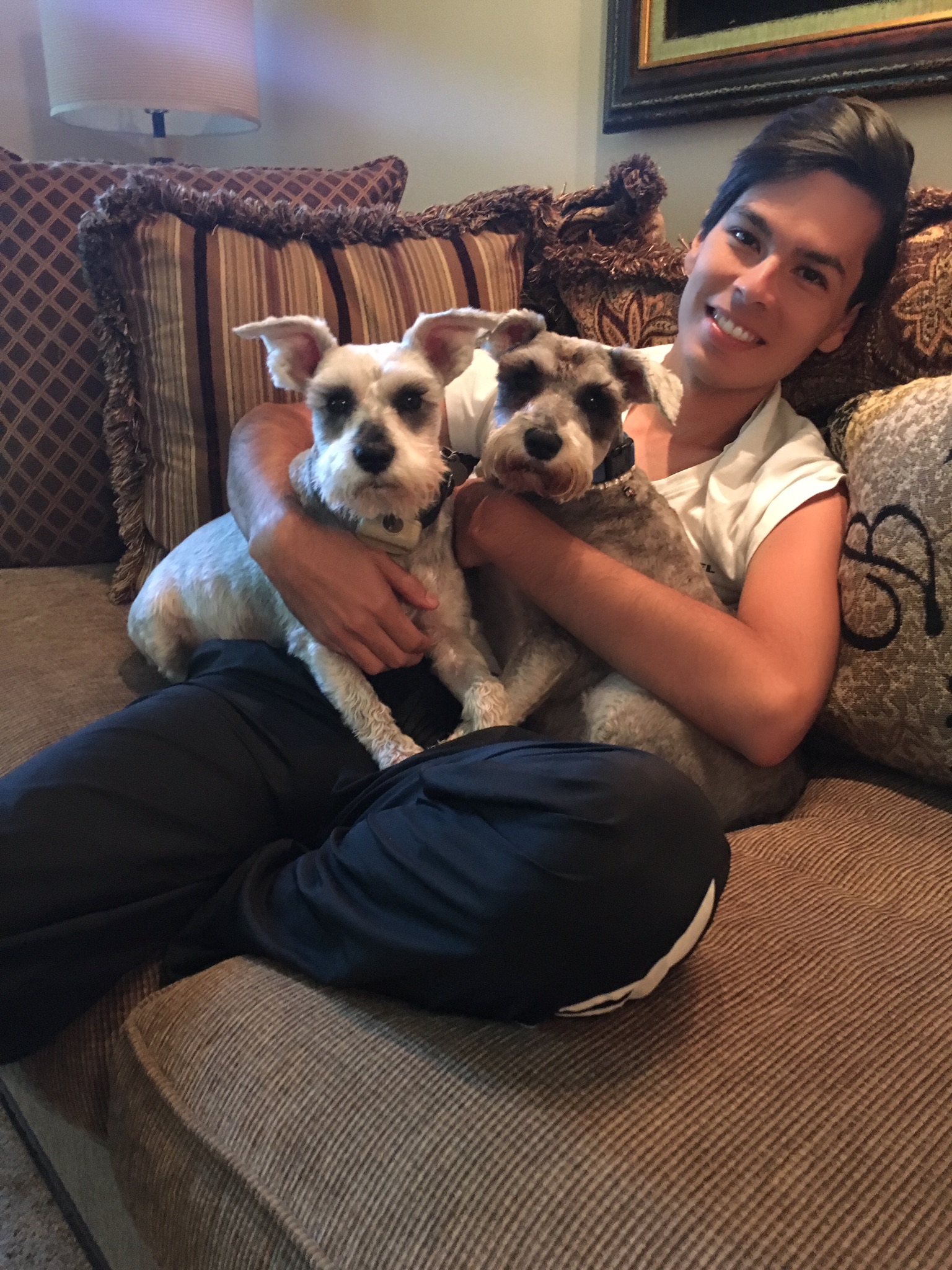 Painting of a person hugging two miniature schnauzers on a couch