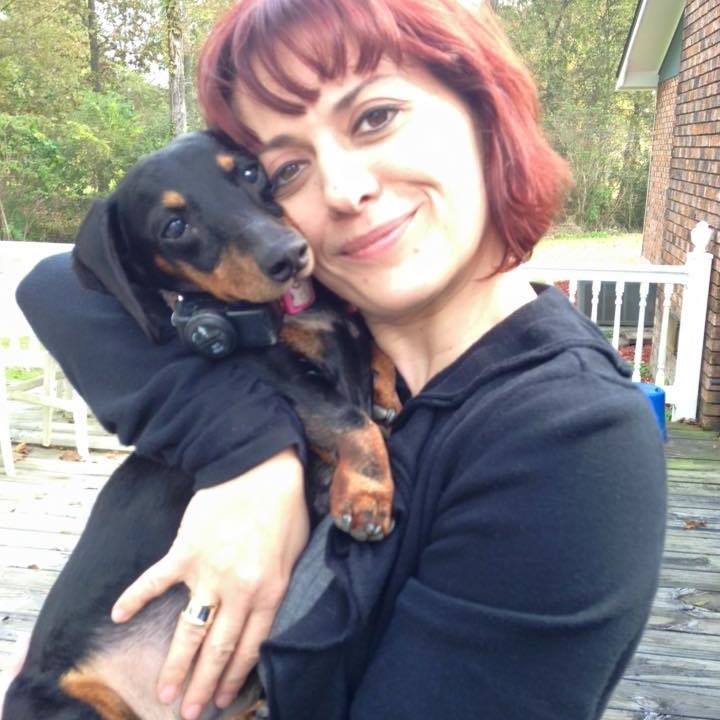 Oil painting of a woman holding a dachshund, Forever in My Heart inscribed below.