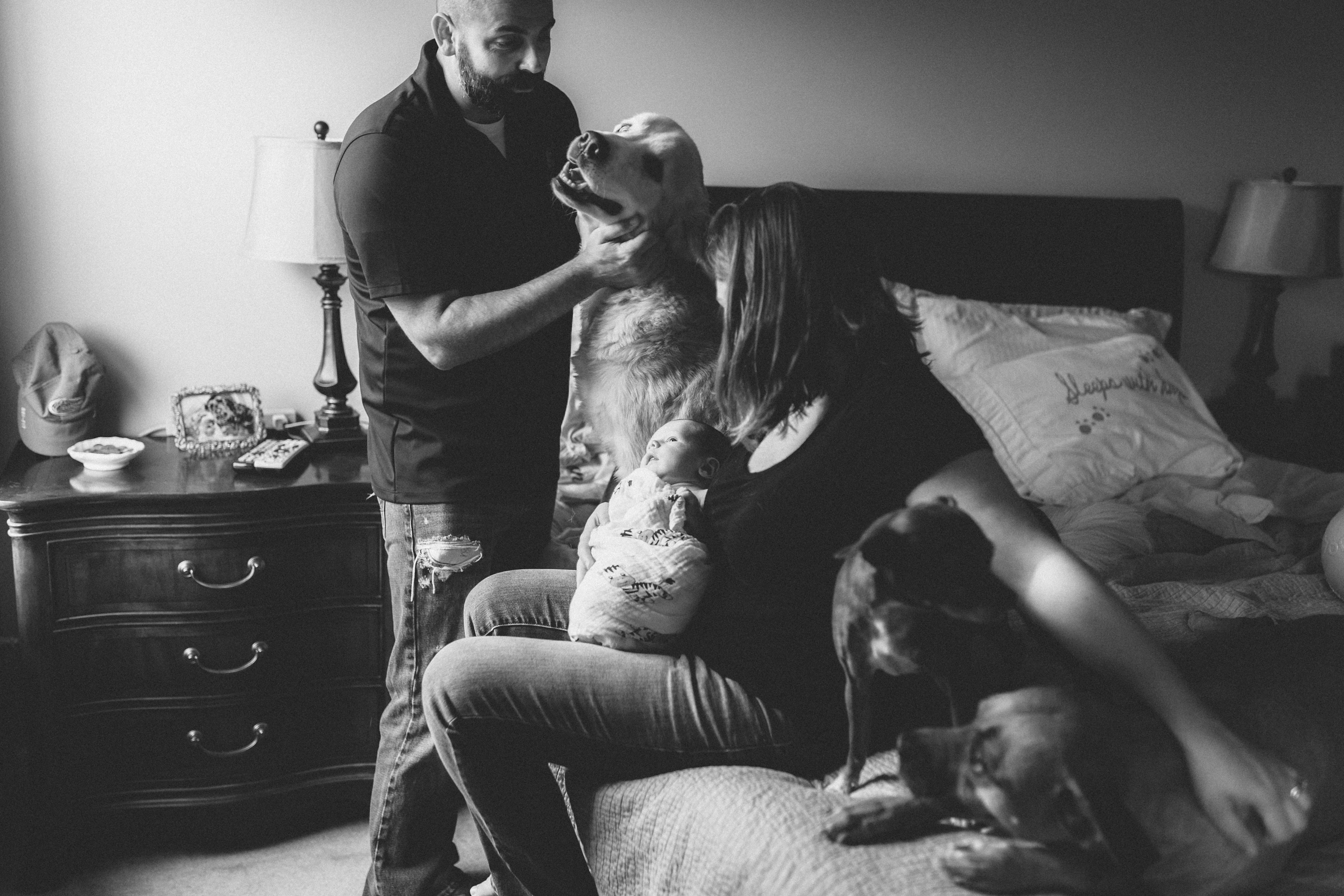 Black and white painting of a family with their dogs and baby.