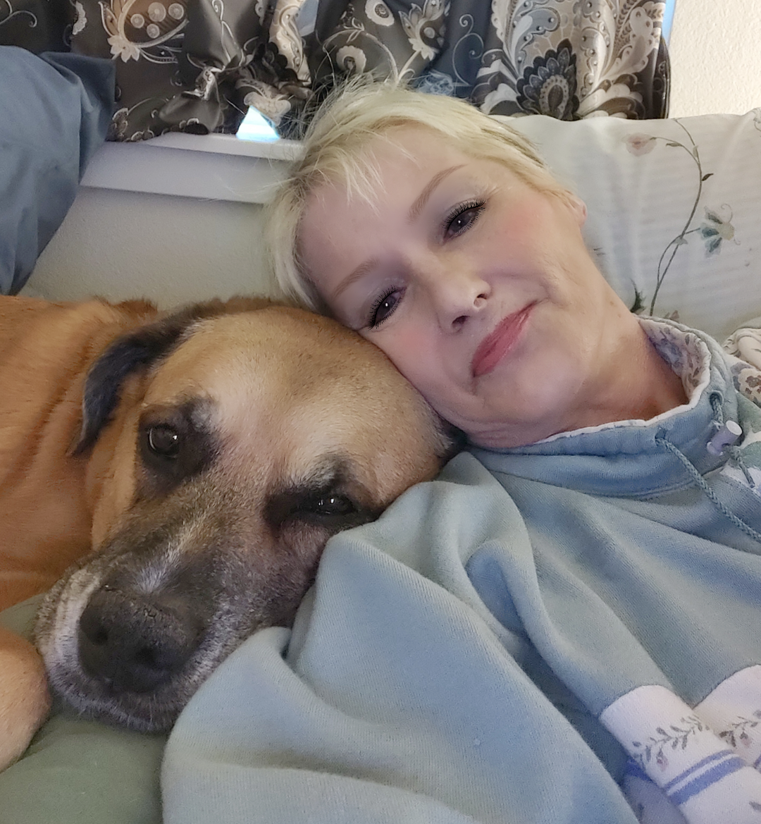 Painting of a woman and her dog cuddling.