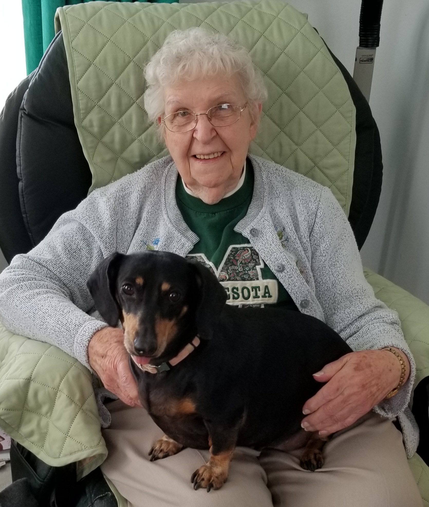 Watercolor portrait of an elderly woman with glasses holding a dachshund.