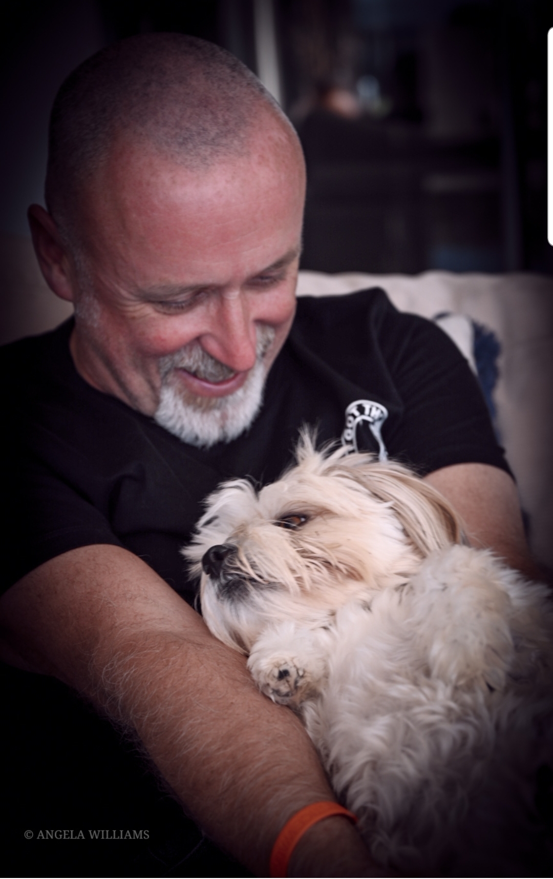 Painting of a man holding a small white dog.
