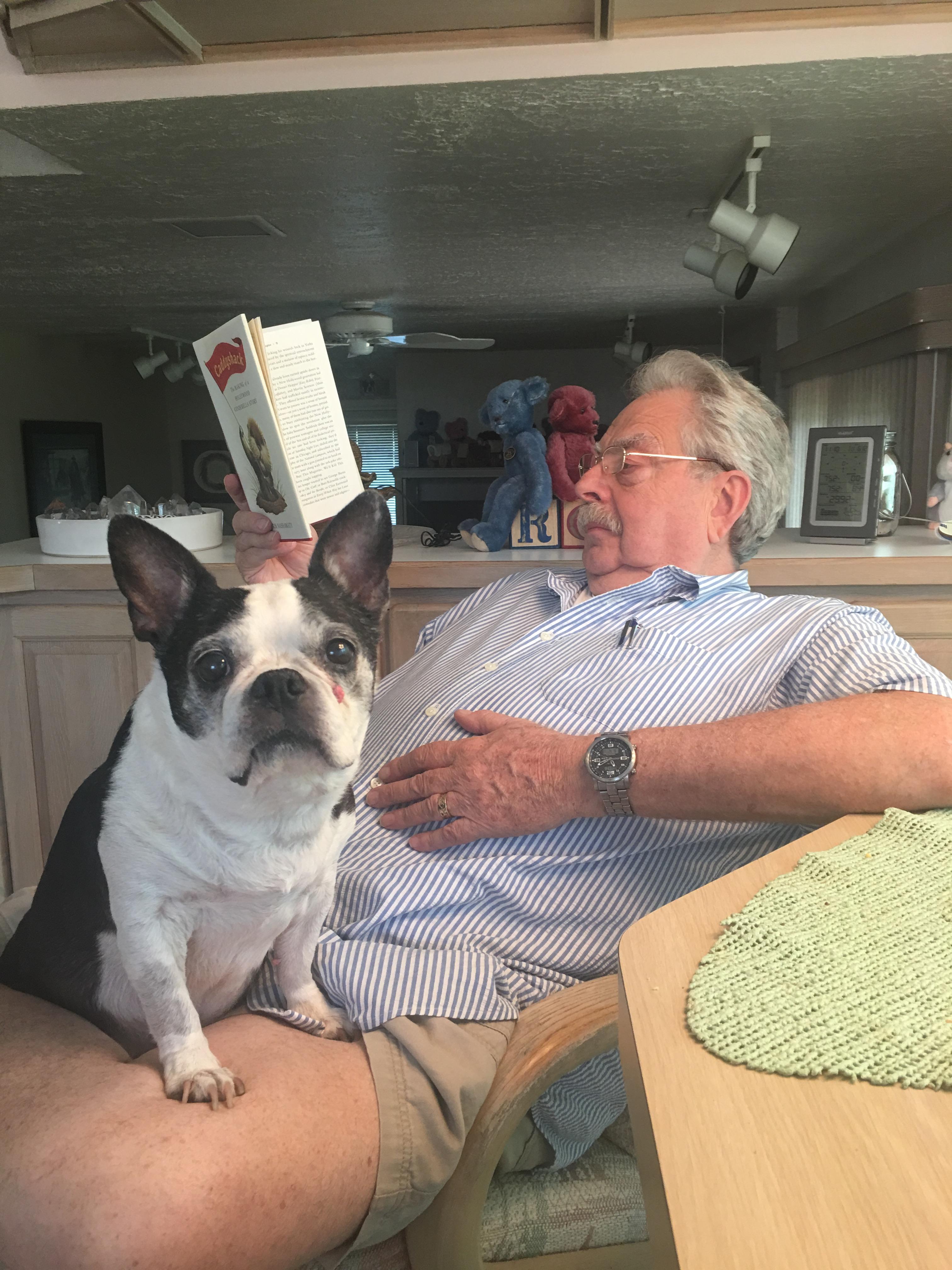 Watercolor painting of an elderly man relaxing with his Boston Terrier.