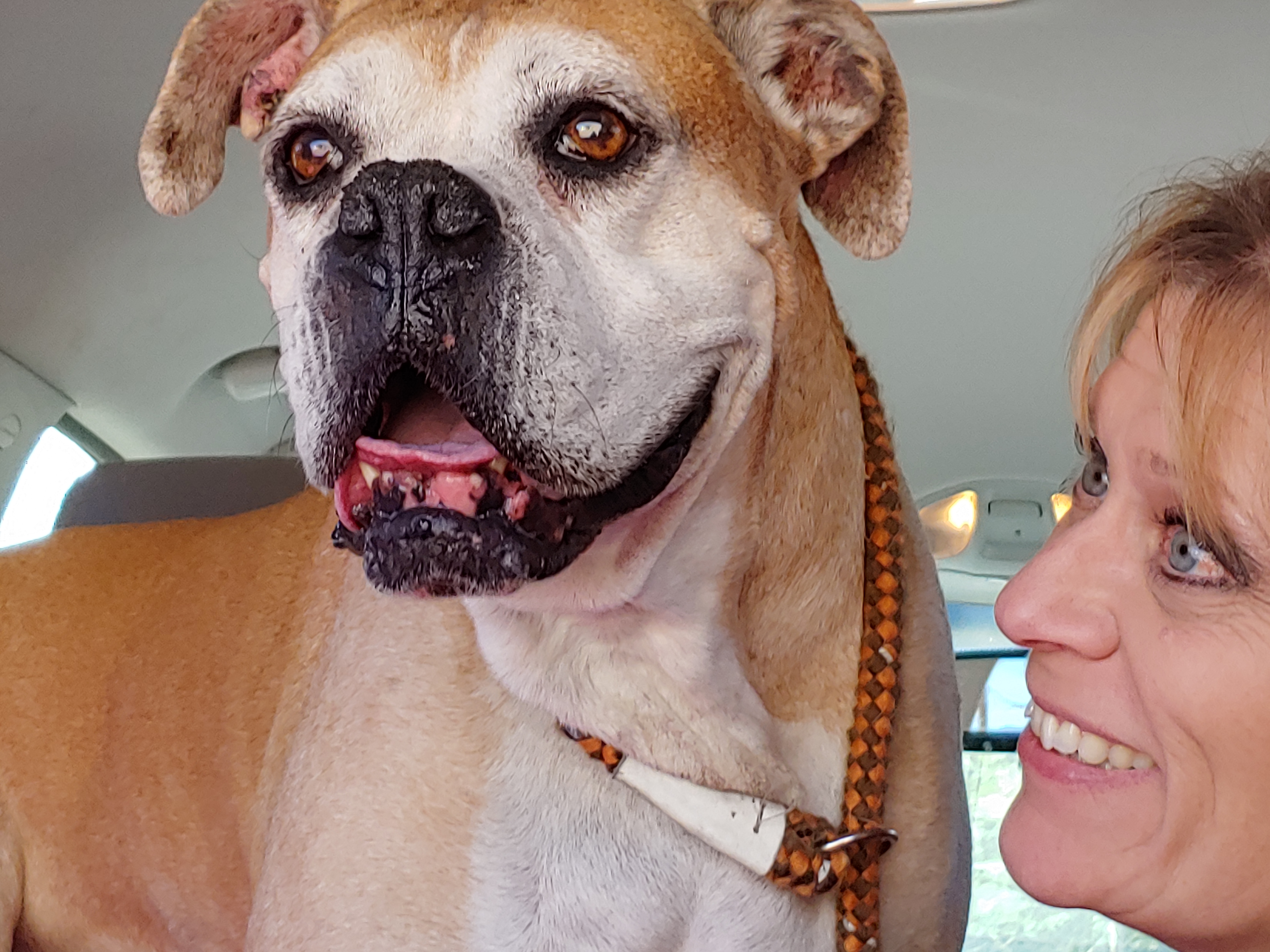 Watercolor painting of a boxer dog and a woman.