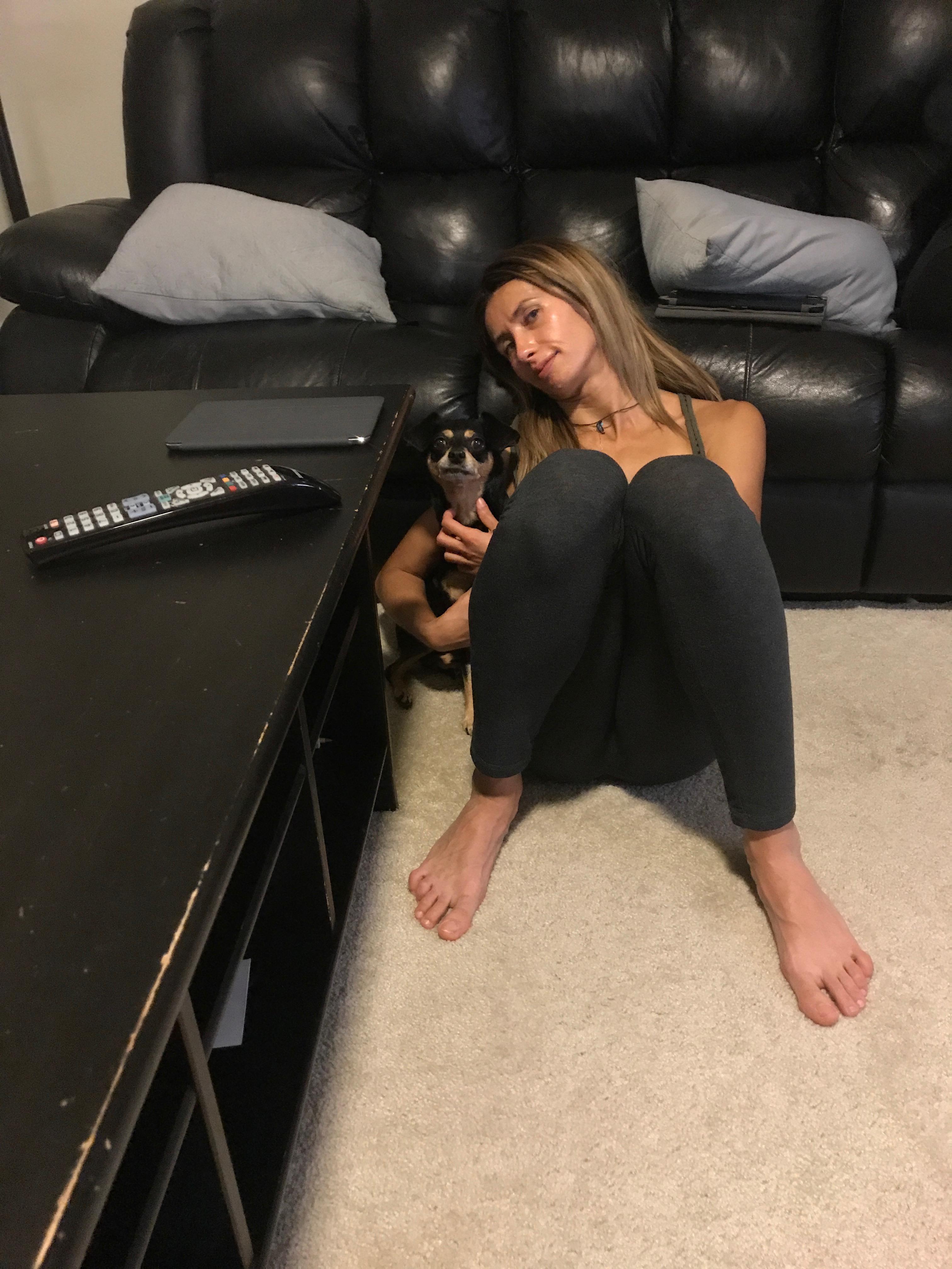 Watercolor painting of a woman sitting on the floor with her small dog, leaning against a couch.