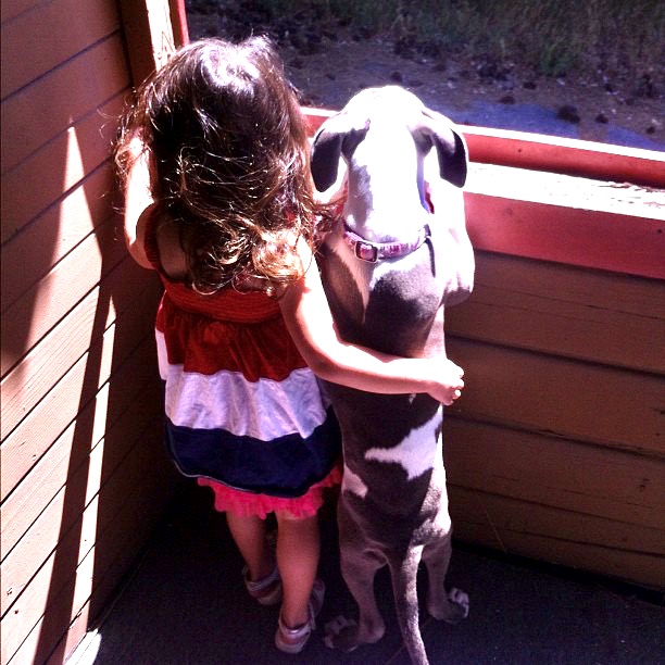 Girl in a patriotic dress hugging a dog from behind.