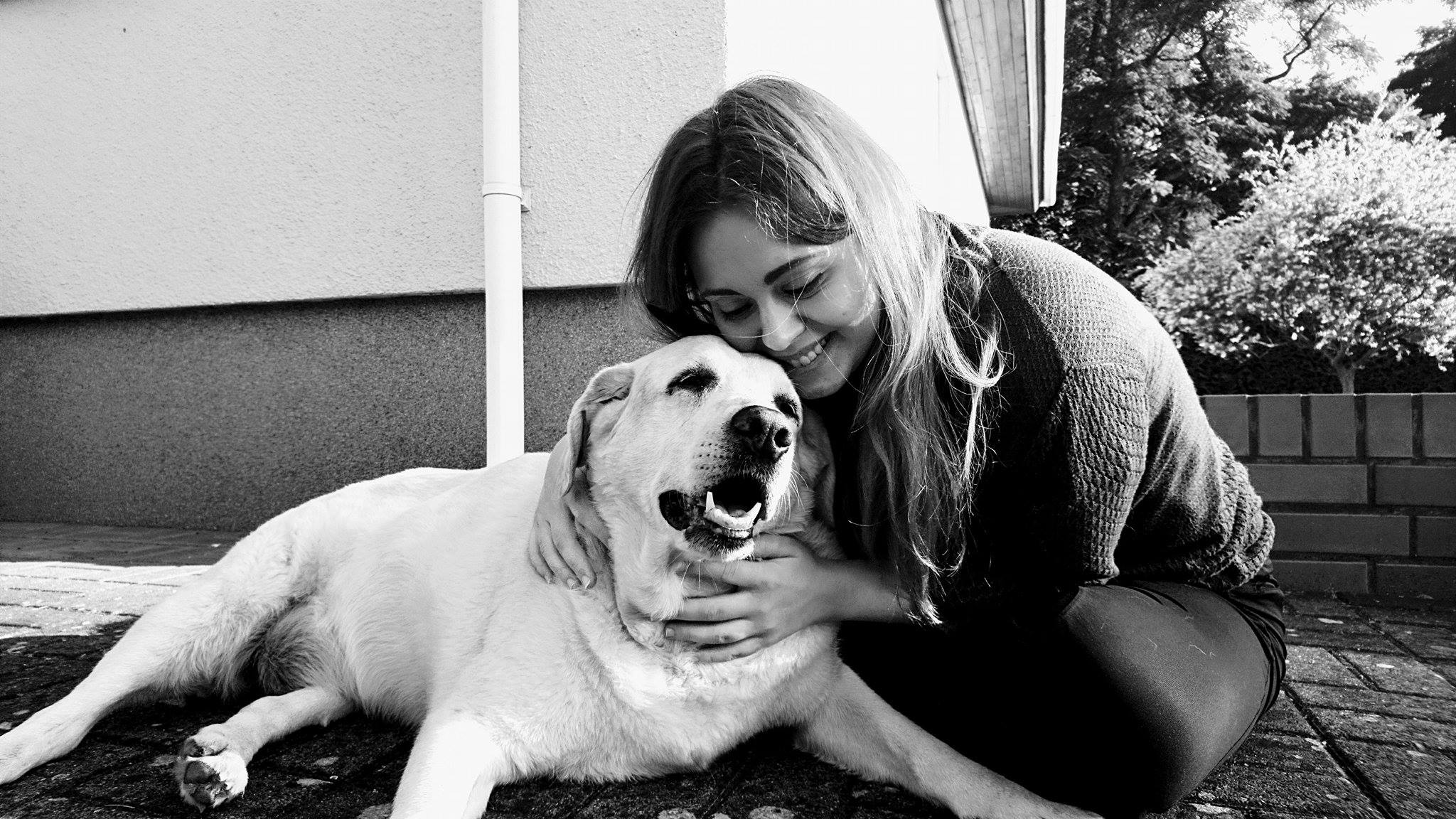 Painting of a girl hugging her Cavalier King Charles Spaniel.